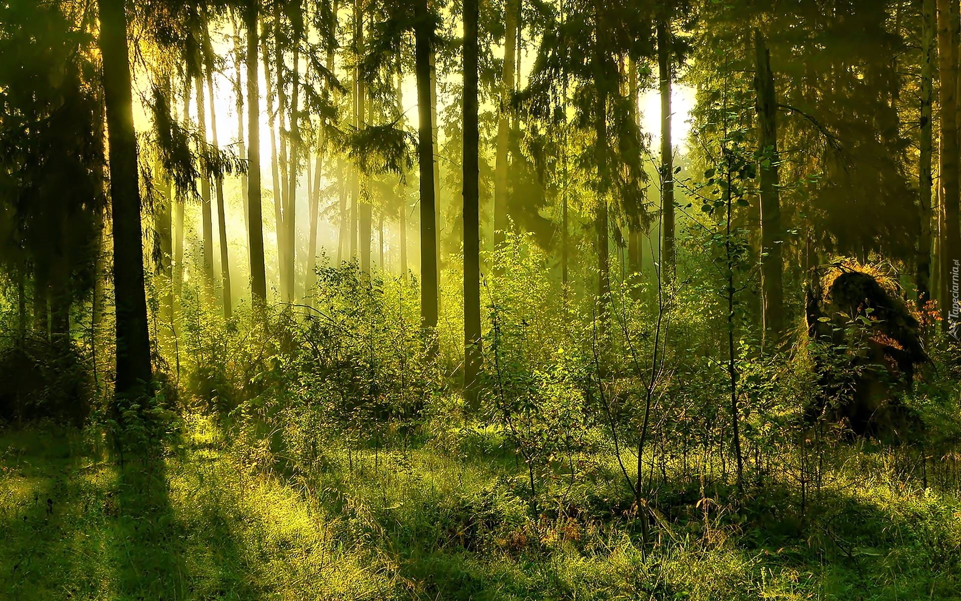 Edytor tapety: Las, Drzewa, Krzewy, Promienie, Słońca