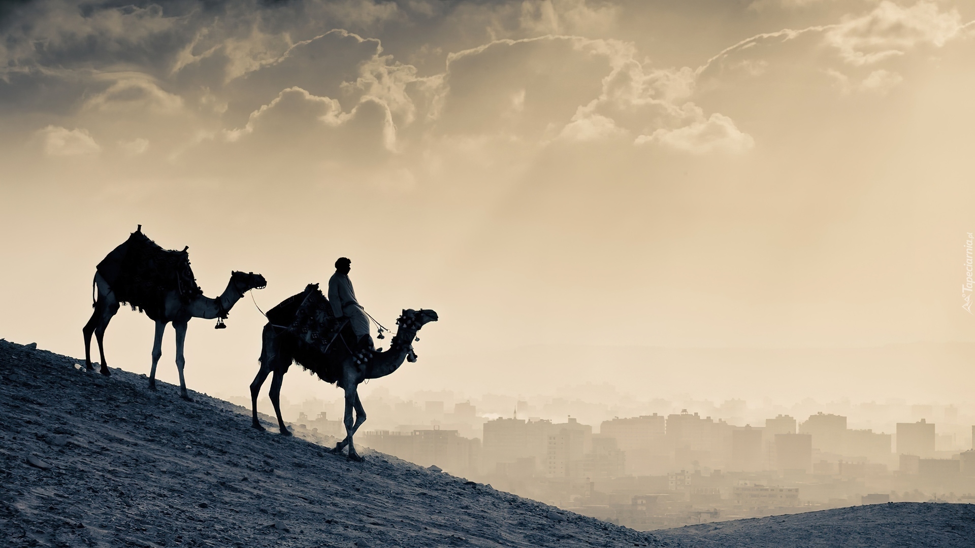 Edytor tapety: Wielbłądy, Piasek, Miasto, Człowiek, Pustynia