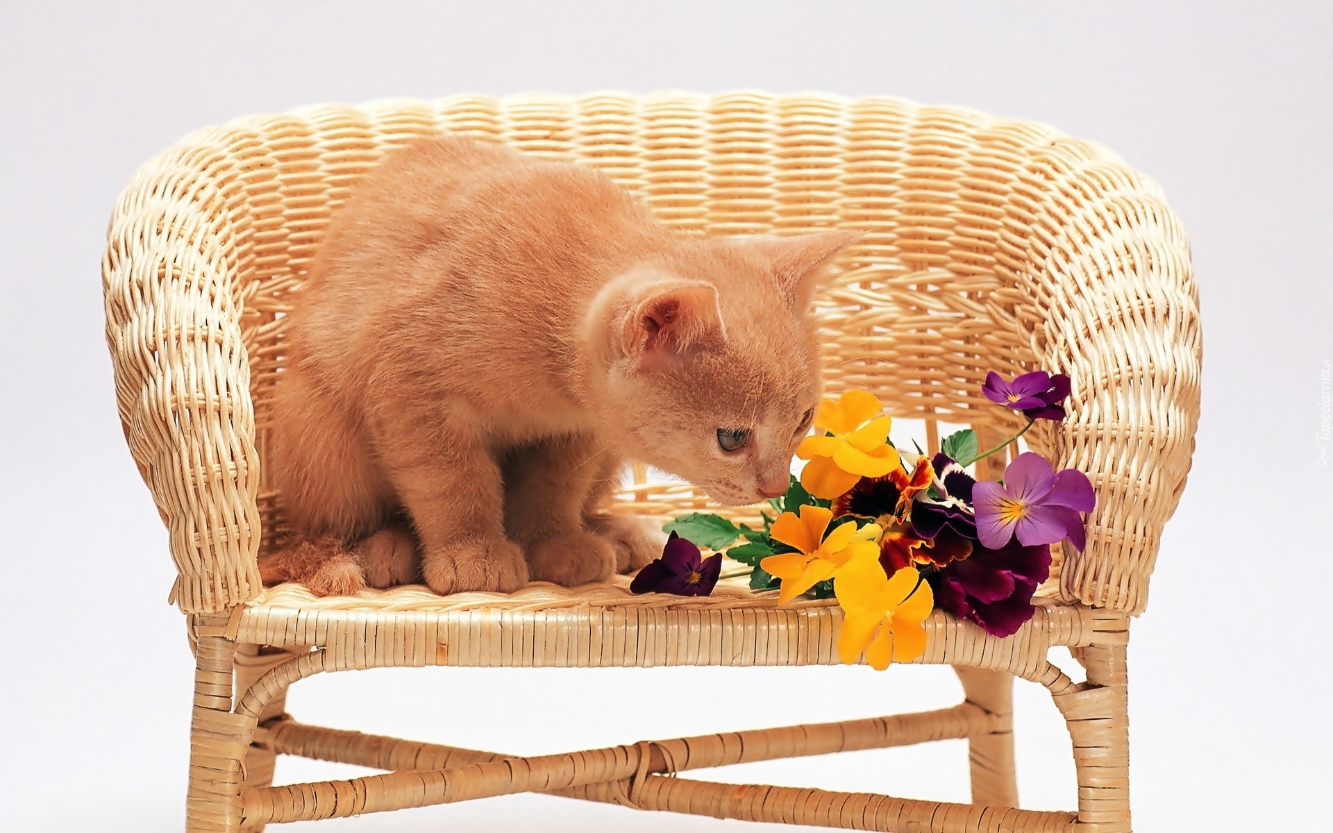 Edytor tapety: Rudym, Kotek, Wiklinowe, Krzesło, Bratki