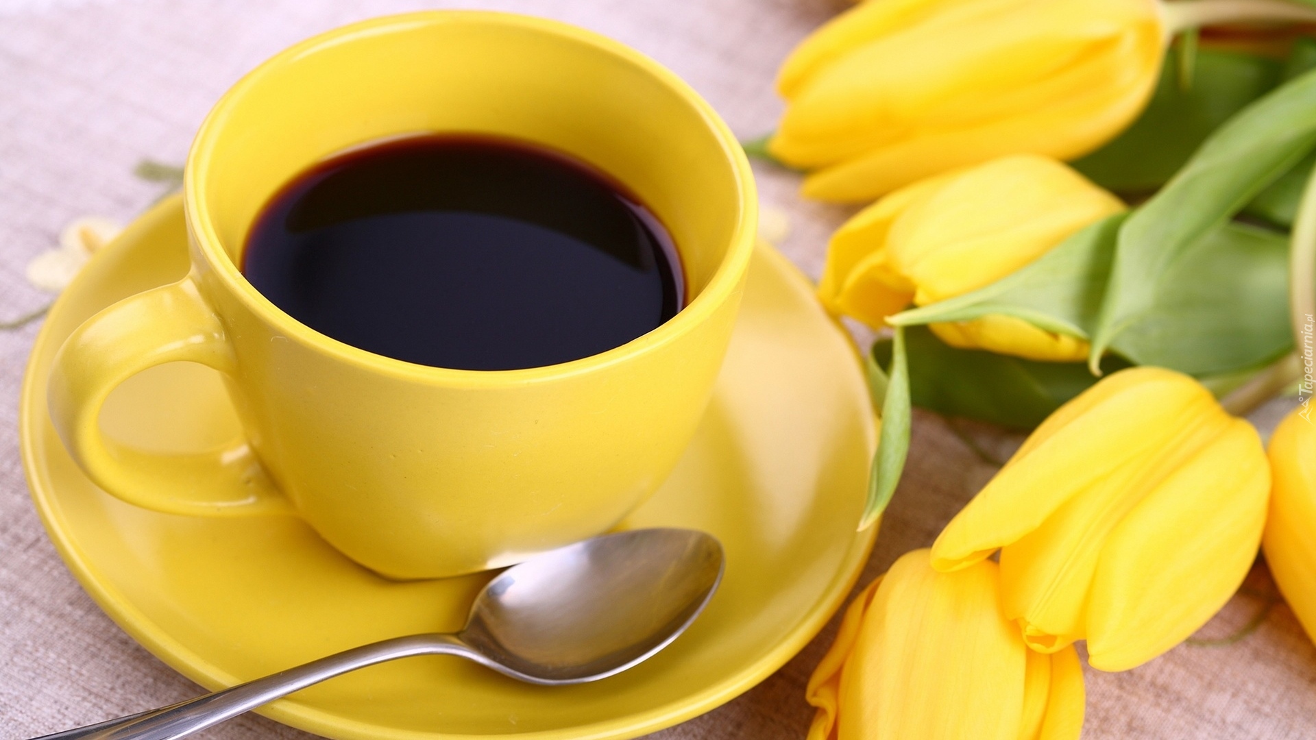 Edytor tapety: Żółta, Filiżanka, Kawa, Tulipany