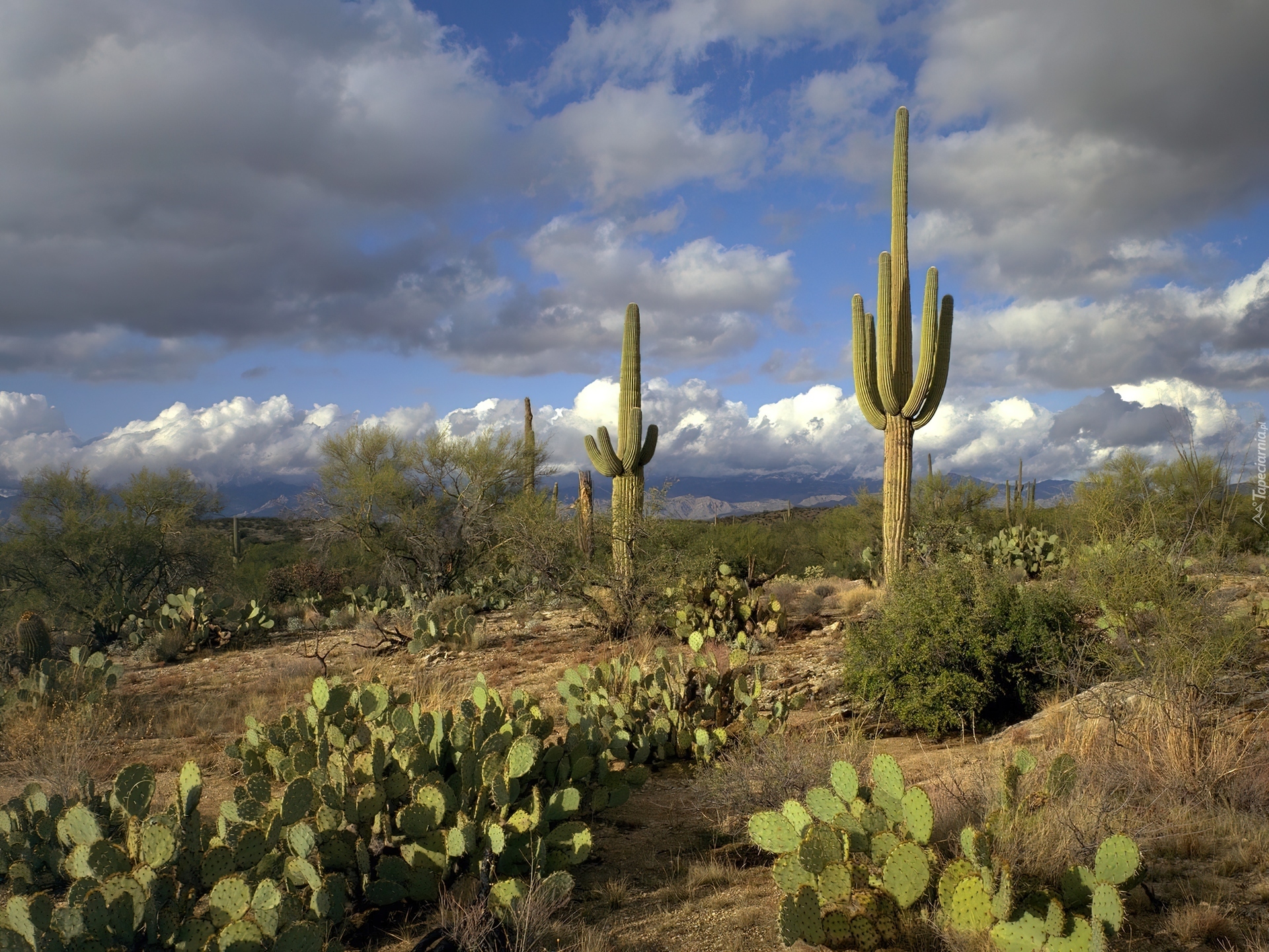 Edytor tapety: Pustynia, Kaktusy, Opuncje, Karnegia olbrzymia, Saguaro, Chmury, Park Narodowy Saguaro, Stan Arizona, Stany Zjednoczone