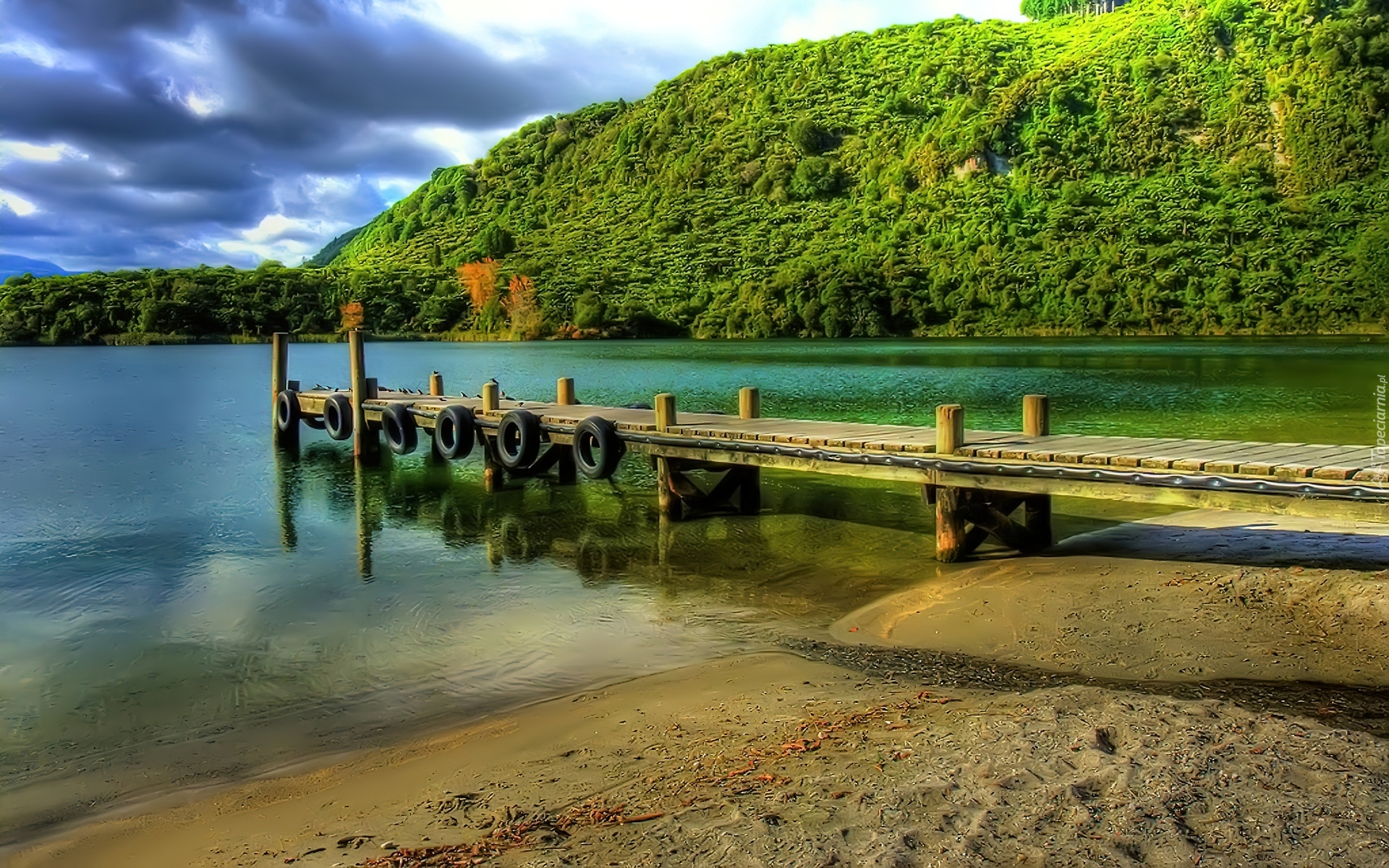 Edytor tapety: Jezioro, Pomost, Wzgórza, Piasek