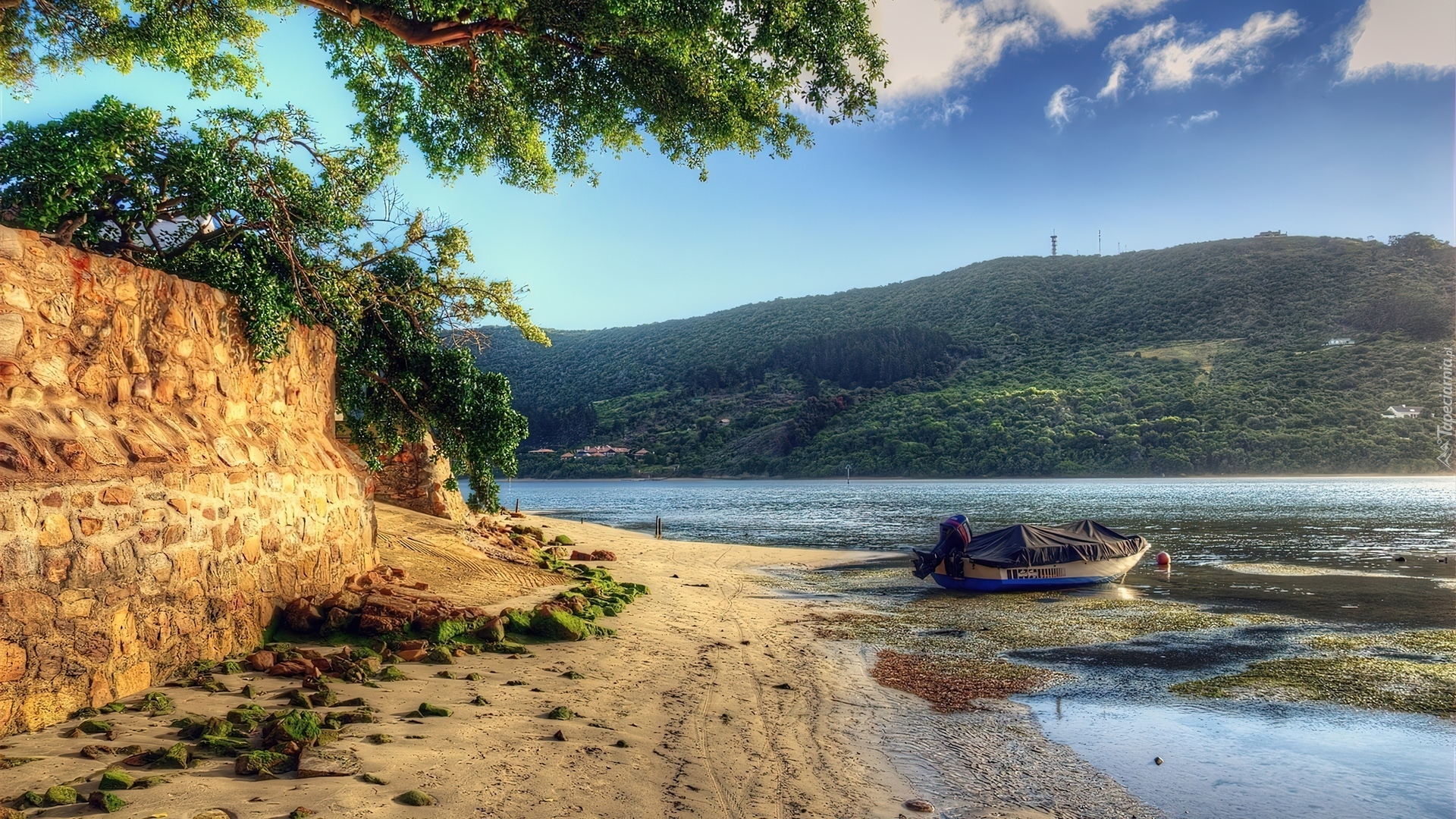 Edytor tapety: Rzeka, Woda, Łódka, Plaża, Piasek, Drzewa
