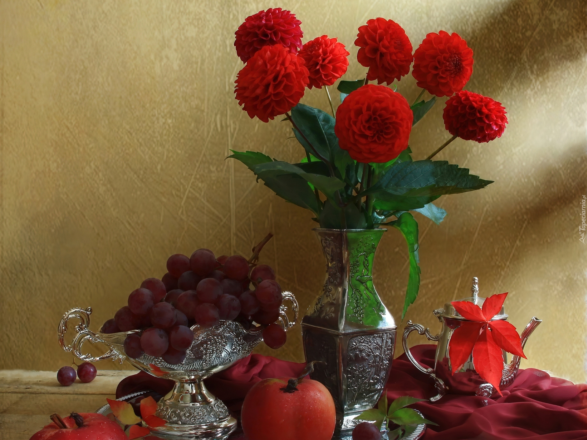 Edytor tapety: Srebrna, Zastawa, Czerwone, Dalie, Owoce