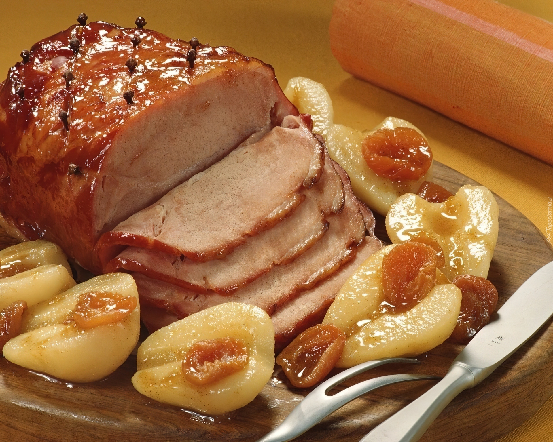 Edytor tapety: Pieczeń, Gruszki, Sztućce, Patera