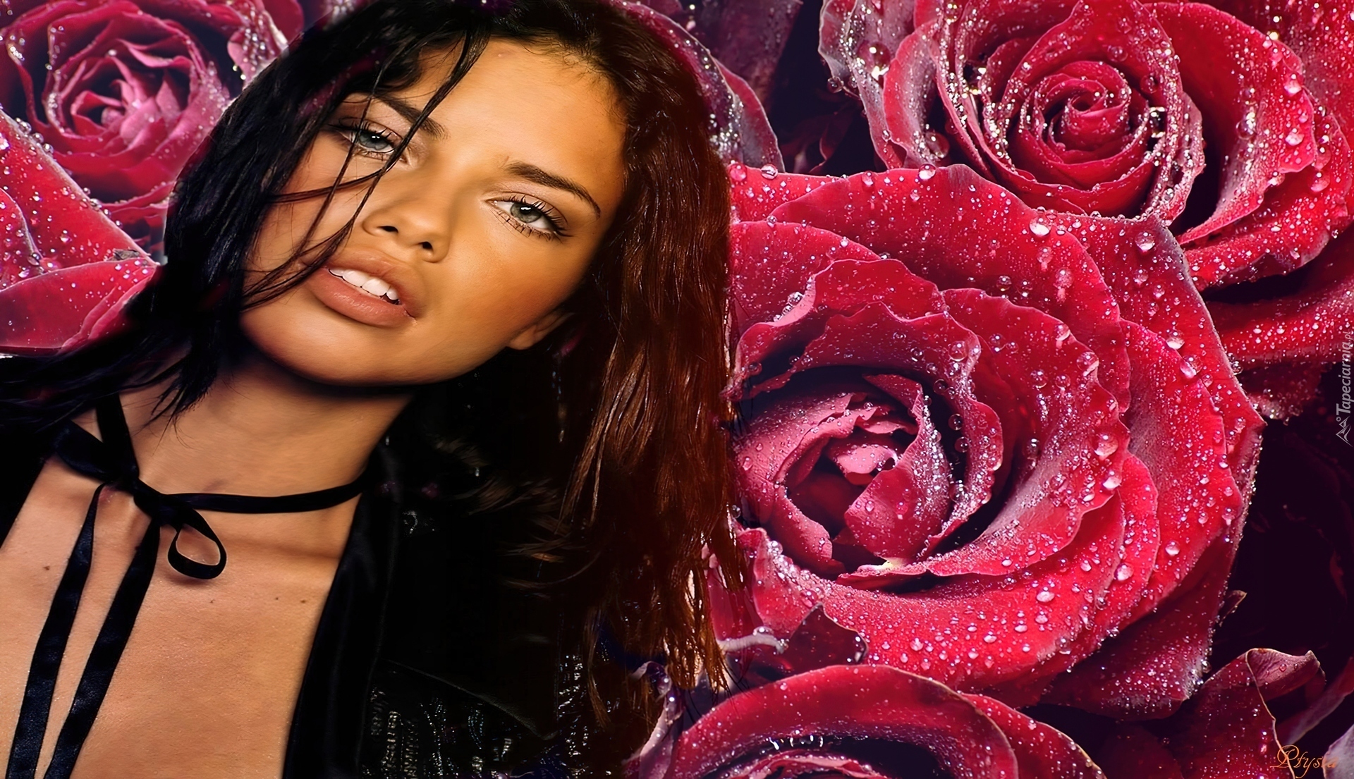 Edytor tapety: Adriana Lima, Czerwone, Róże, Krople, Wody