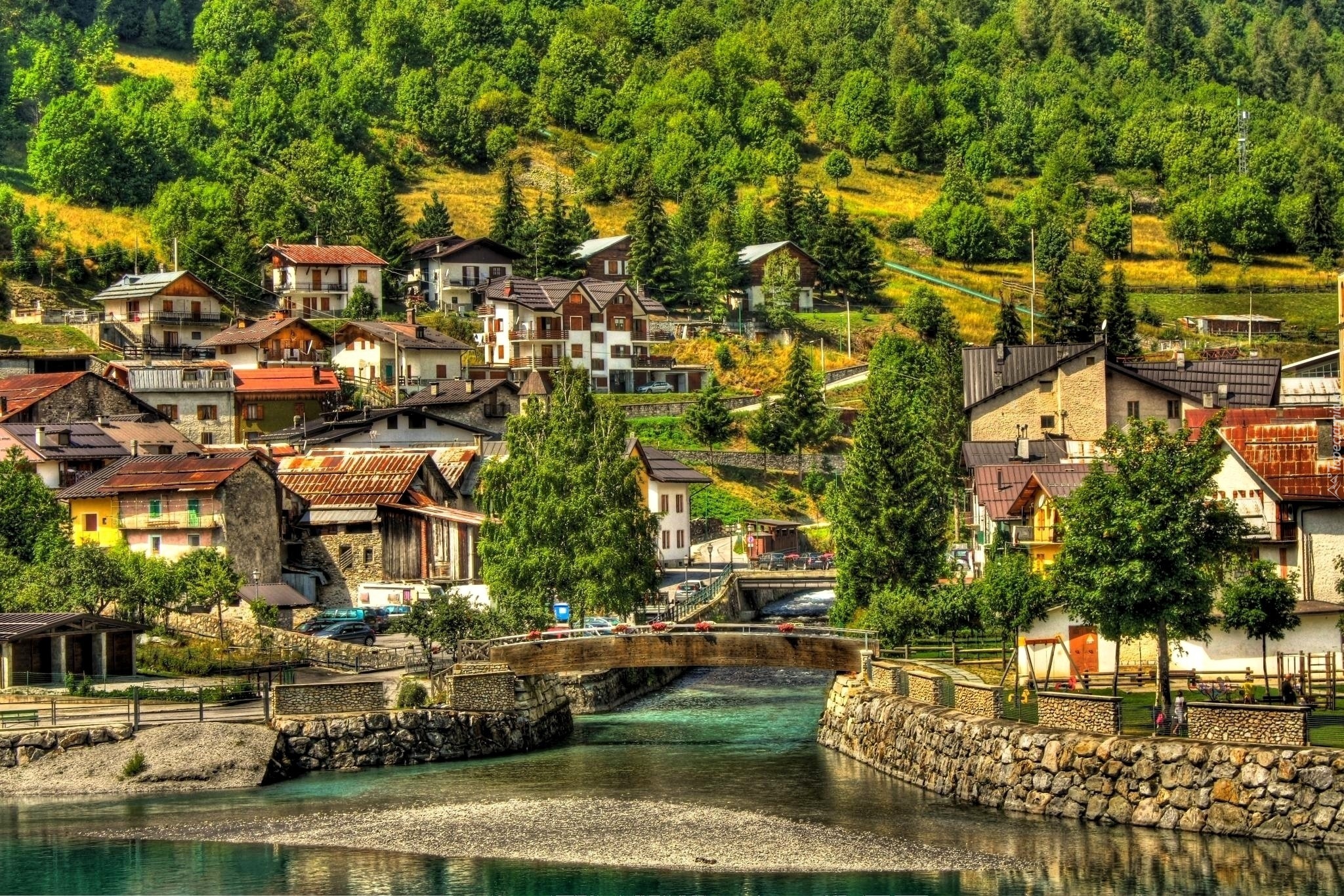 Edytor tapety: Most, Brzegi, Rzeki, Pagórki, Domy