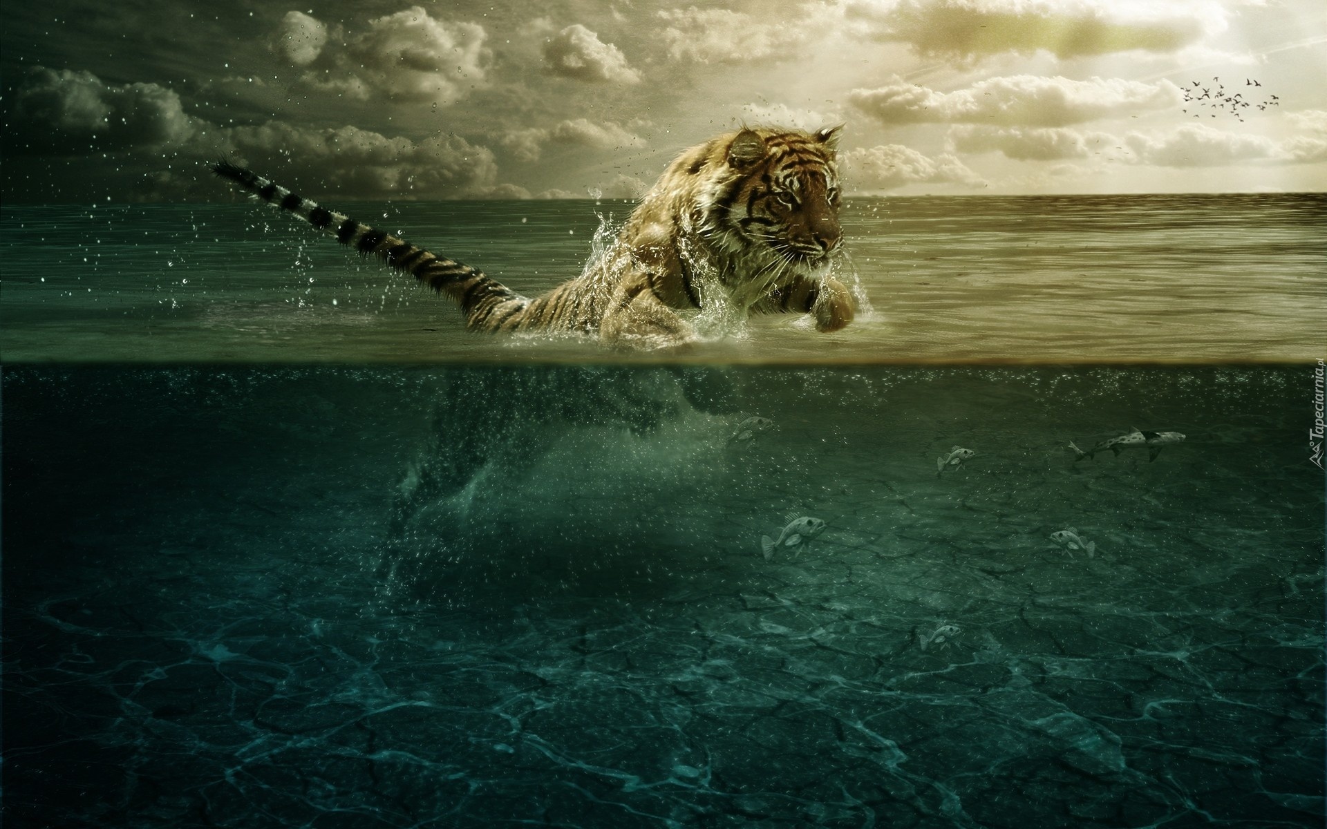 Edytor tapety: Tygrys, Woda, Ryby, Chmury