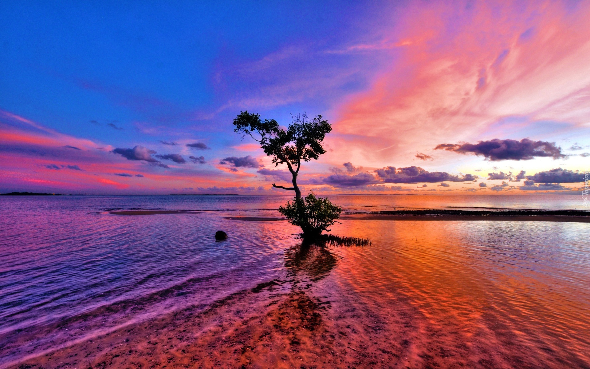 Edytor tapety: Chmury, Zachód, Słońca, Jezioro, Drzewo