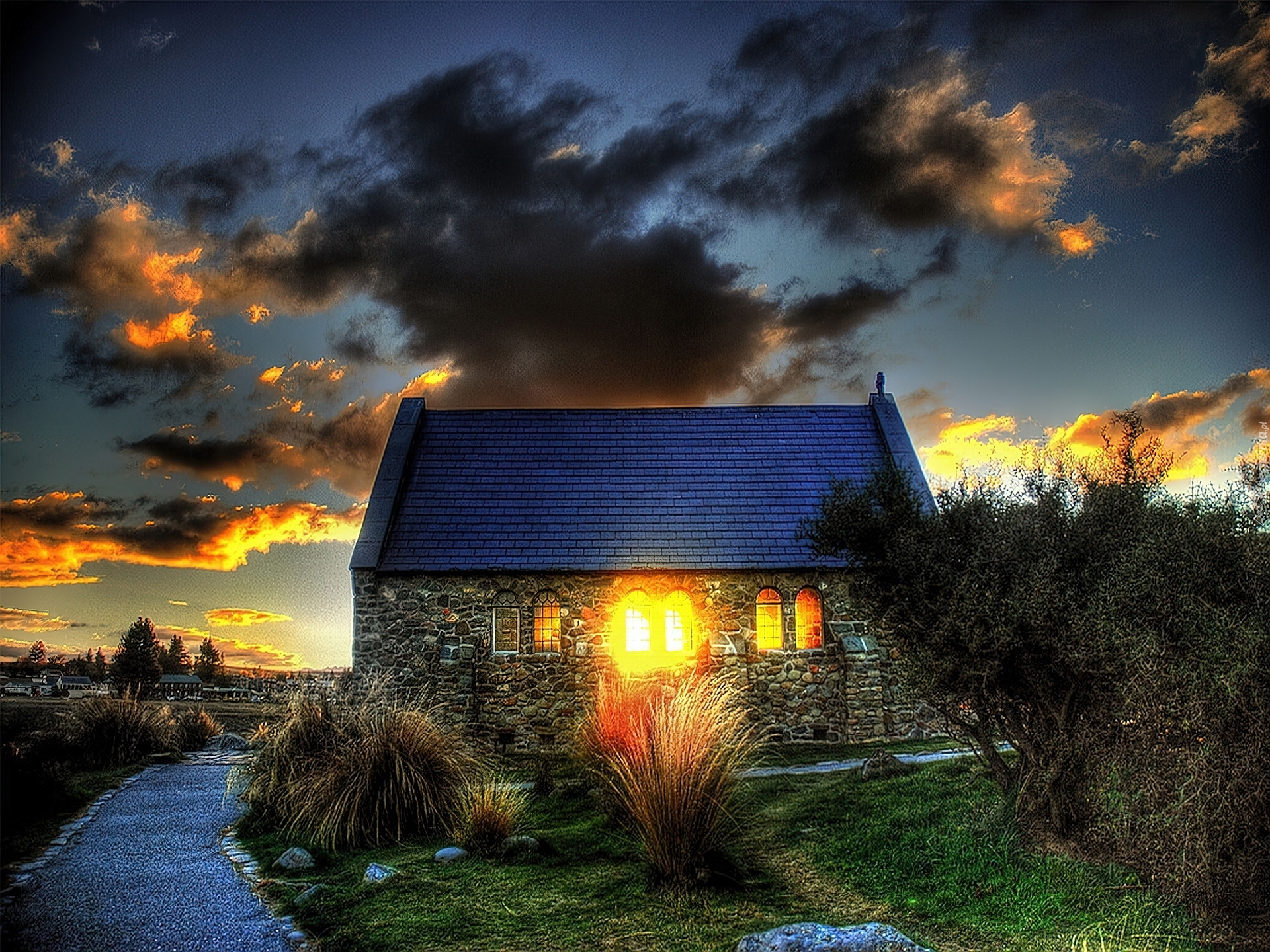 Edytor tapety: Chmury, Zachód, Słońca, Dom, Drzewa