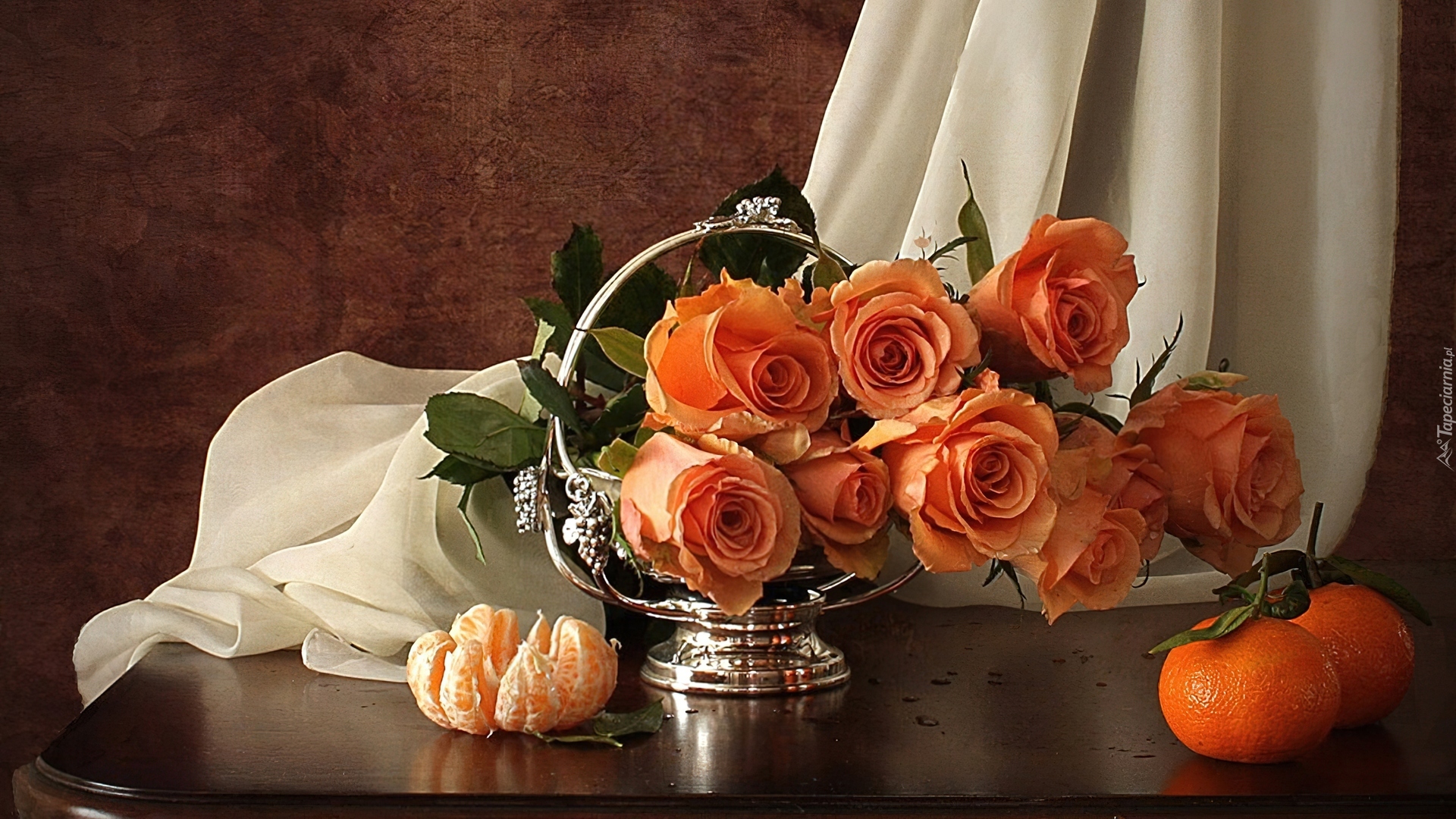 Edytor tapety: Łososiowe, Róże, Biały, Szal, Mandarynki, Srebrna, Patera