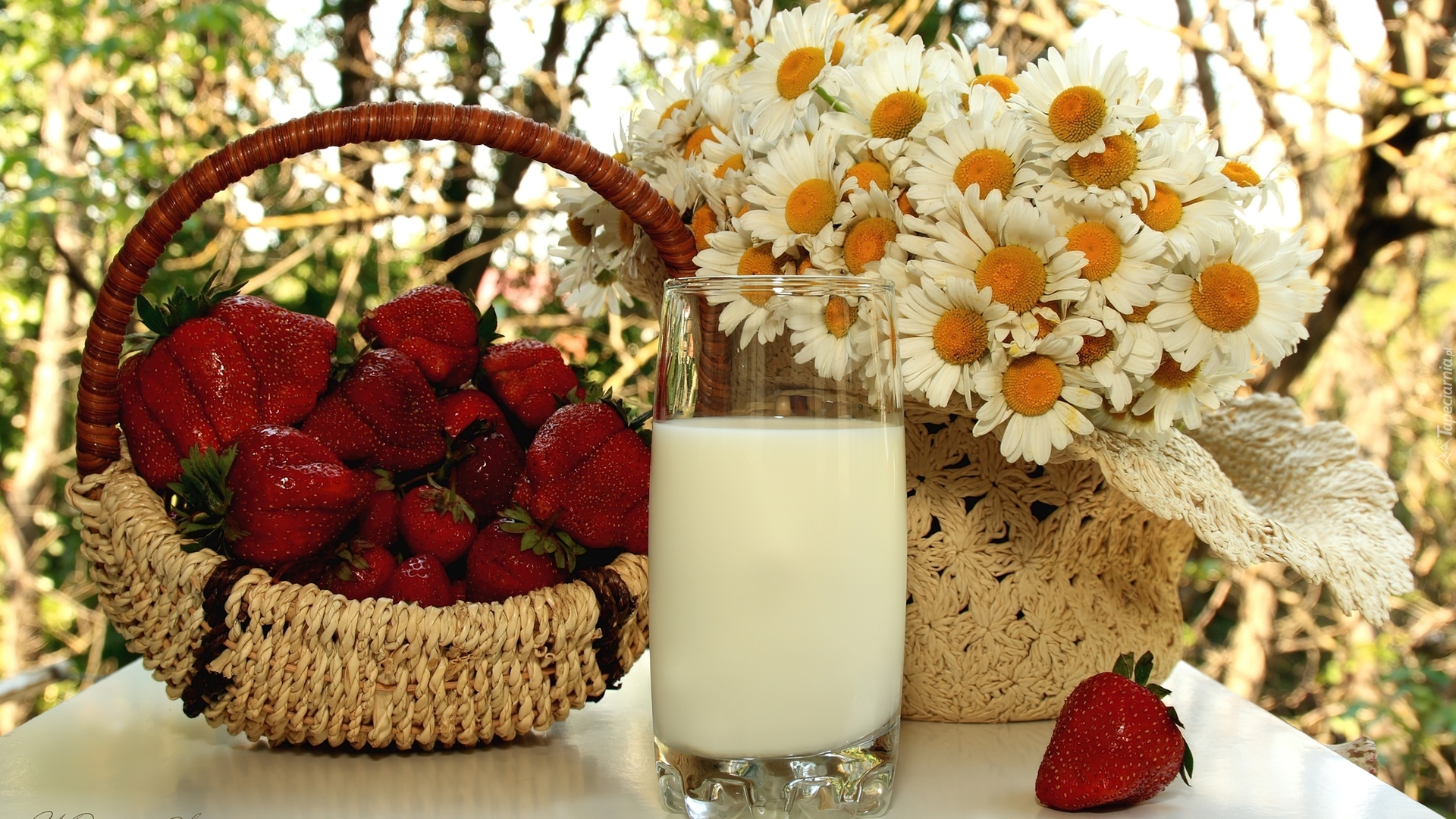Edytor tapety: Koszyki, Truskawki, Mleko, Margarytki