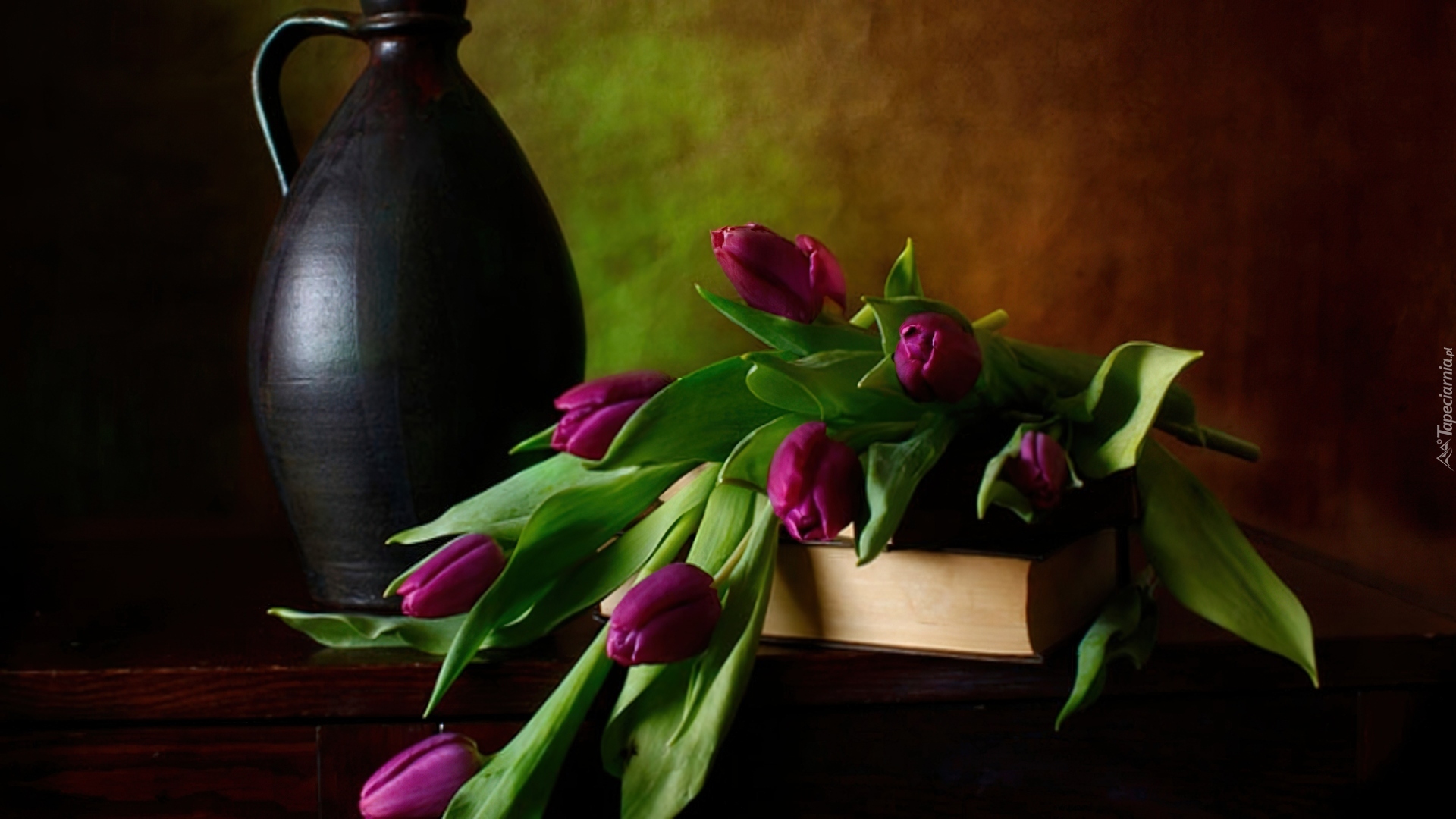 Edytor tapety: Gliniany, Dzban, Fioletowe, Tulipany, Książka