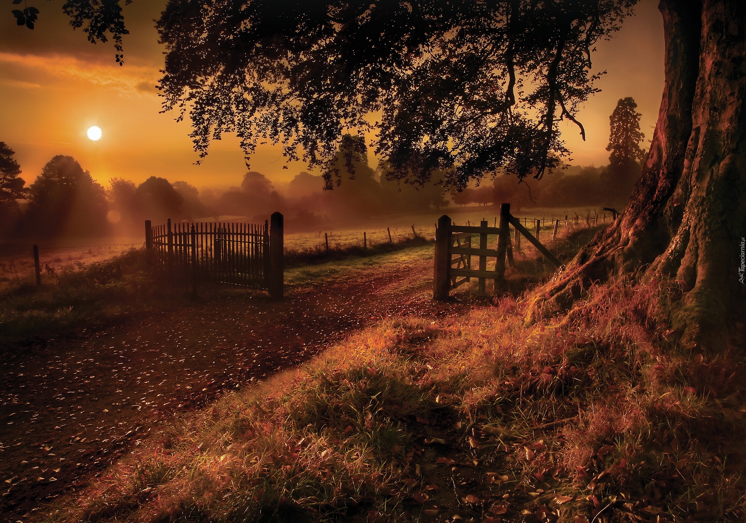 Edytor tapety: Zachód, Słońca, Wiejska, Droga, Brama