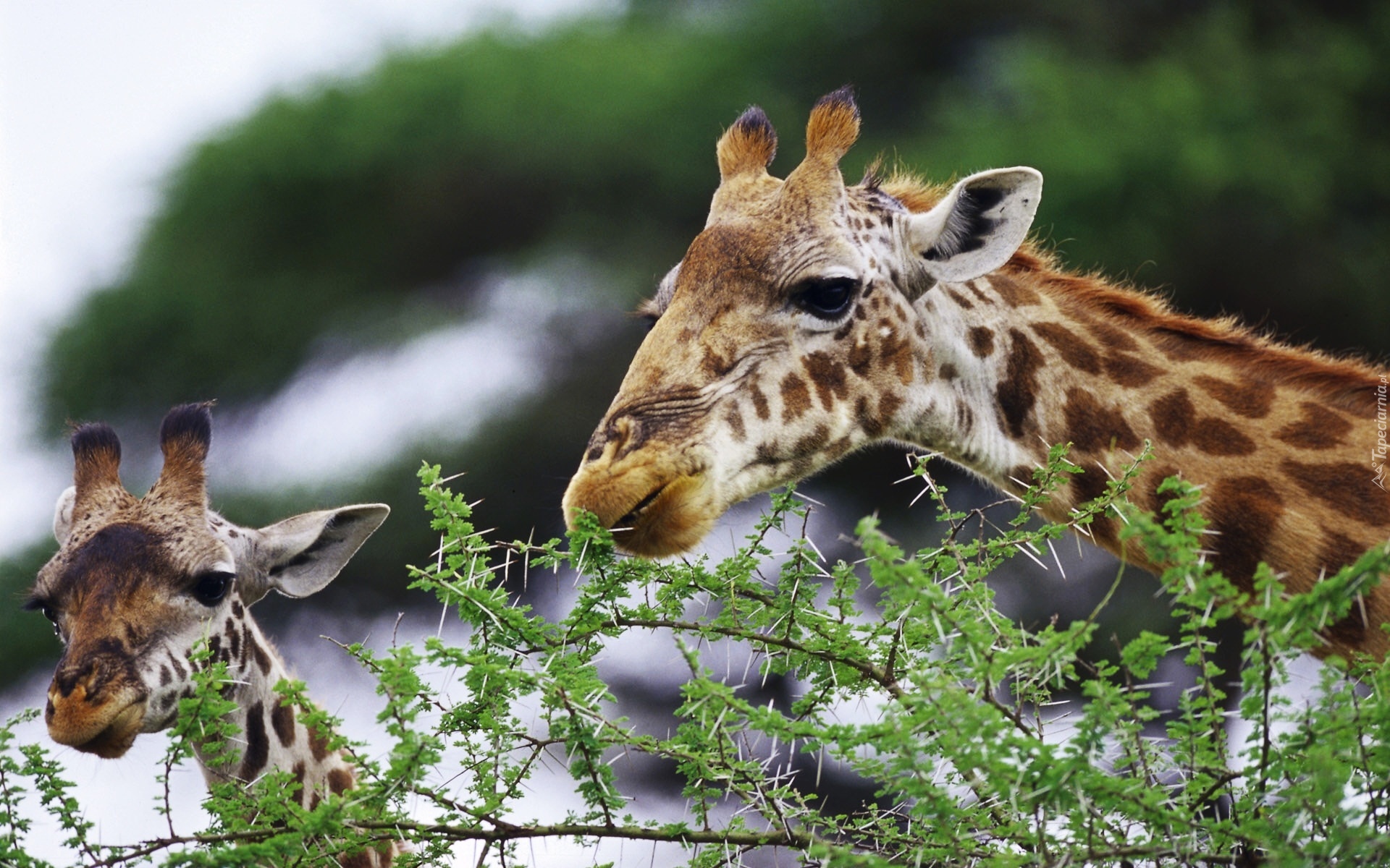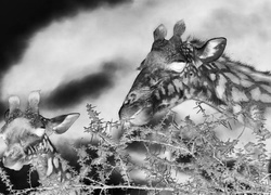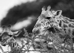 Edytor tapety: Dwie, Żyrafy, Głowy, Gałązki
