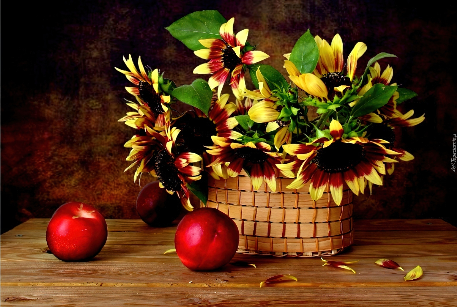 Edytor tapety: Koszyk, Słoneczniki, Nektarynki