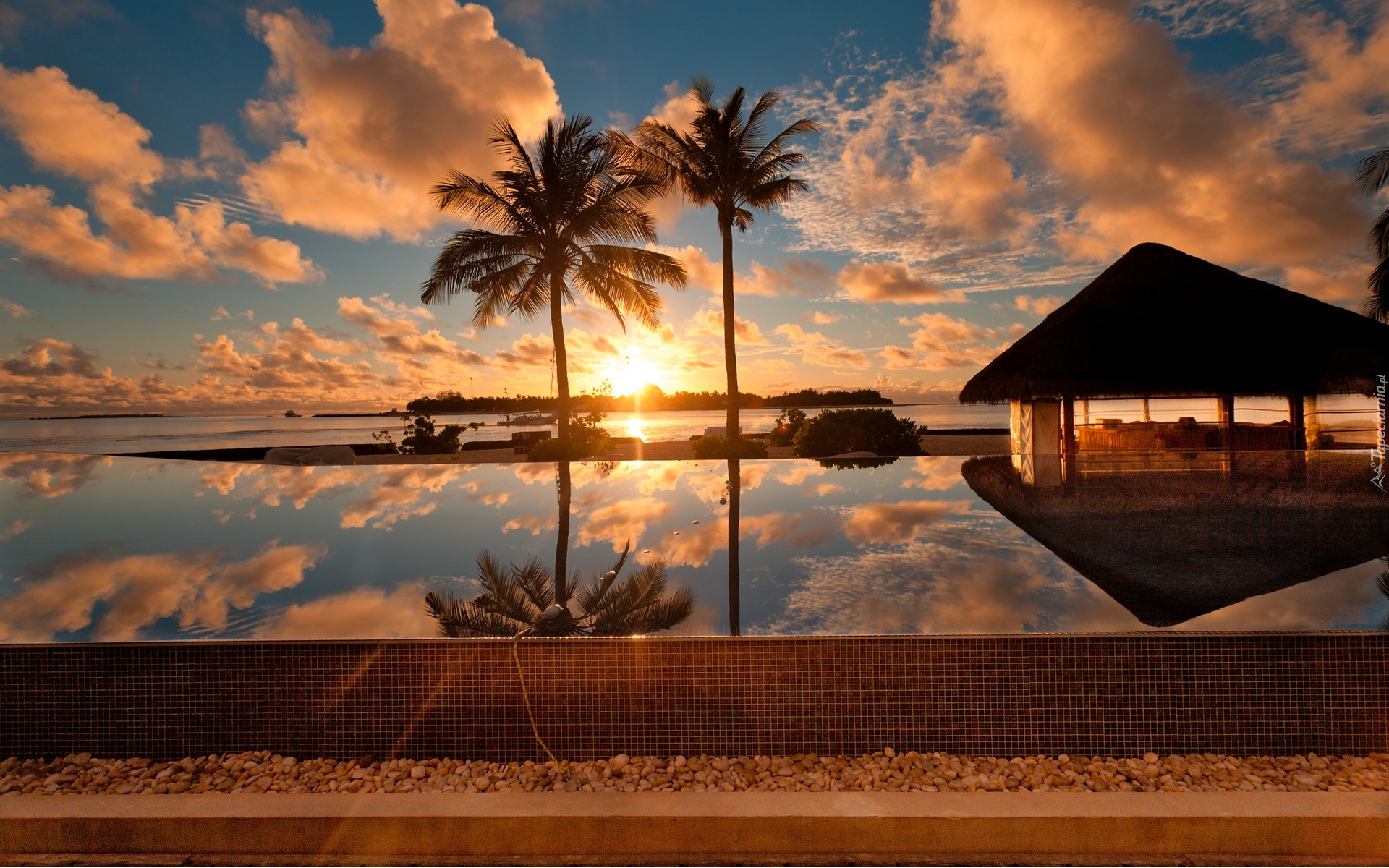 Edytor tapety: Chmury, Morze, Zachód, Słońca, Domek, Odbicie