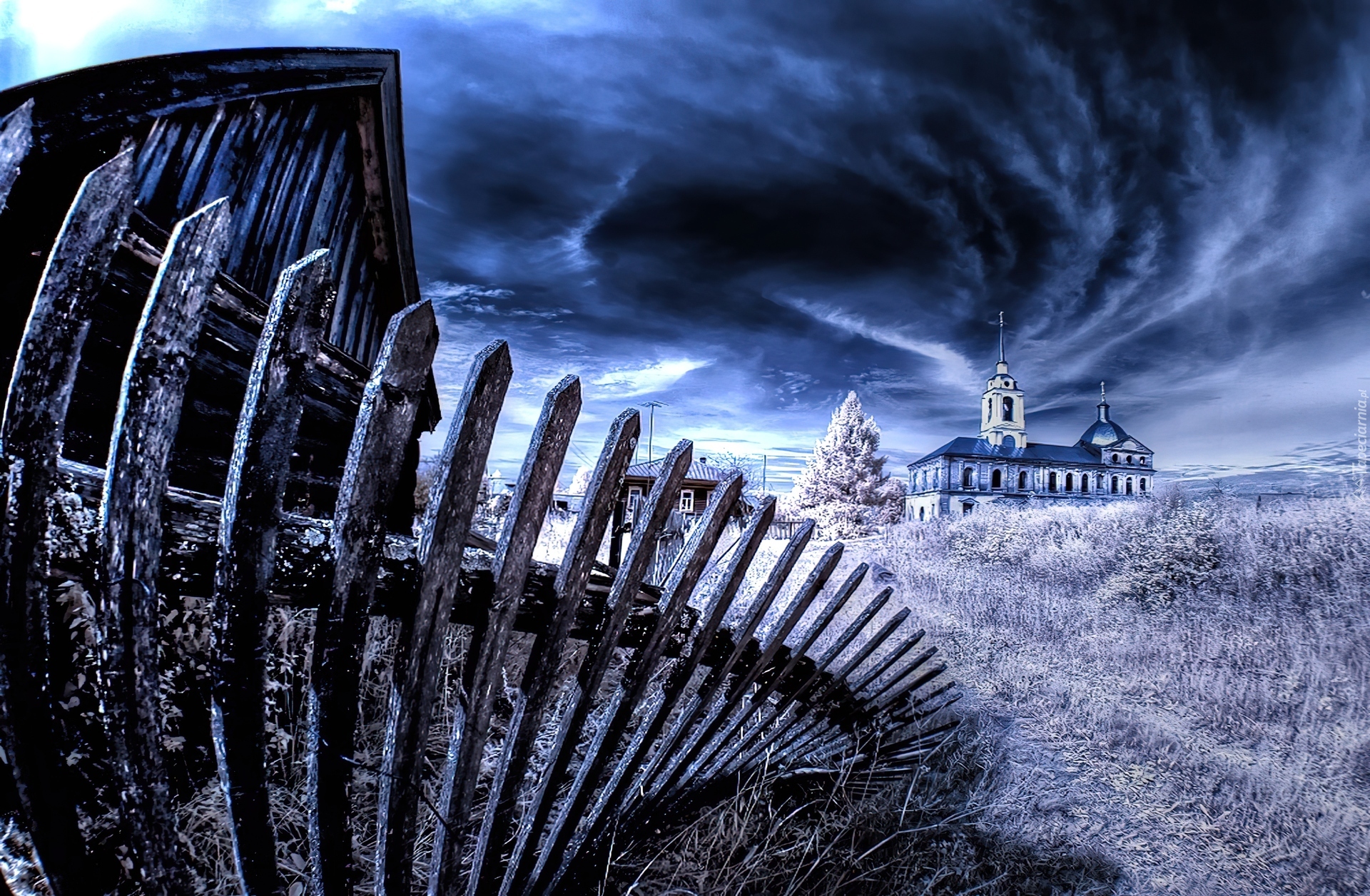 Edytor tapety: Budynek, Chmury, Pochylony, Płot