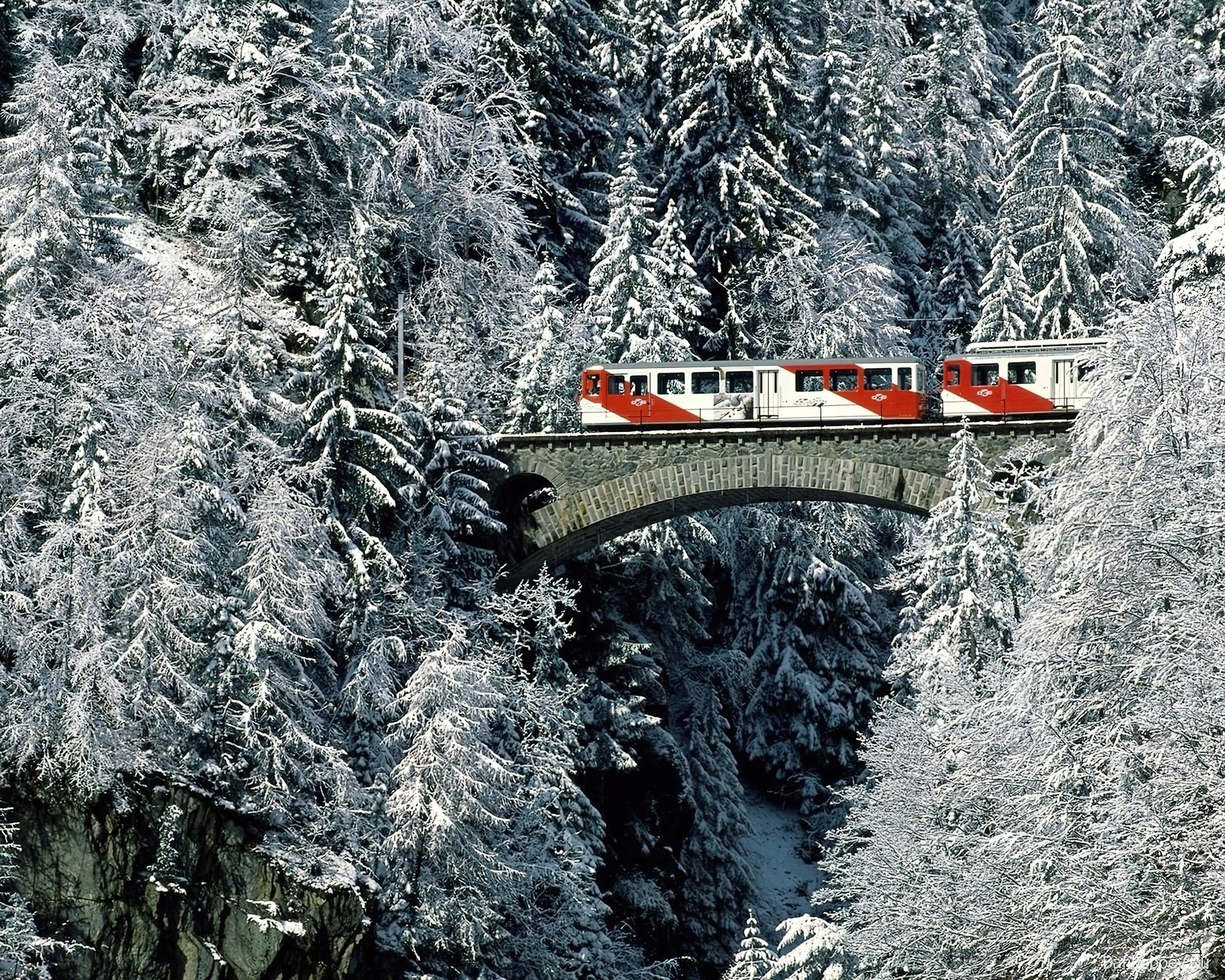 Edytor tapety: Ośnieżone, Drzewa, Zima, Most, Pociąg