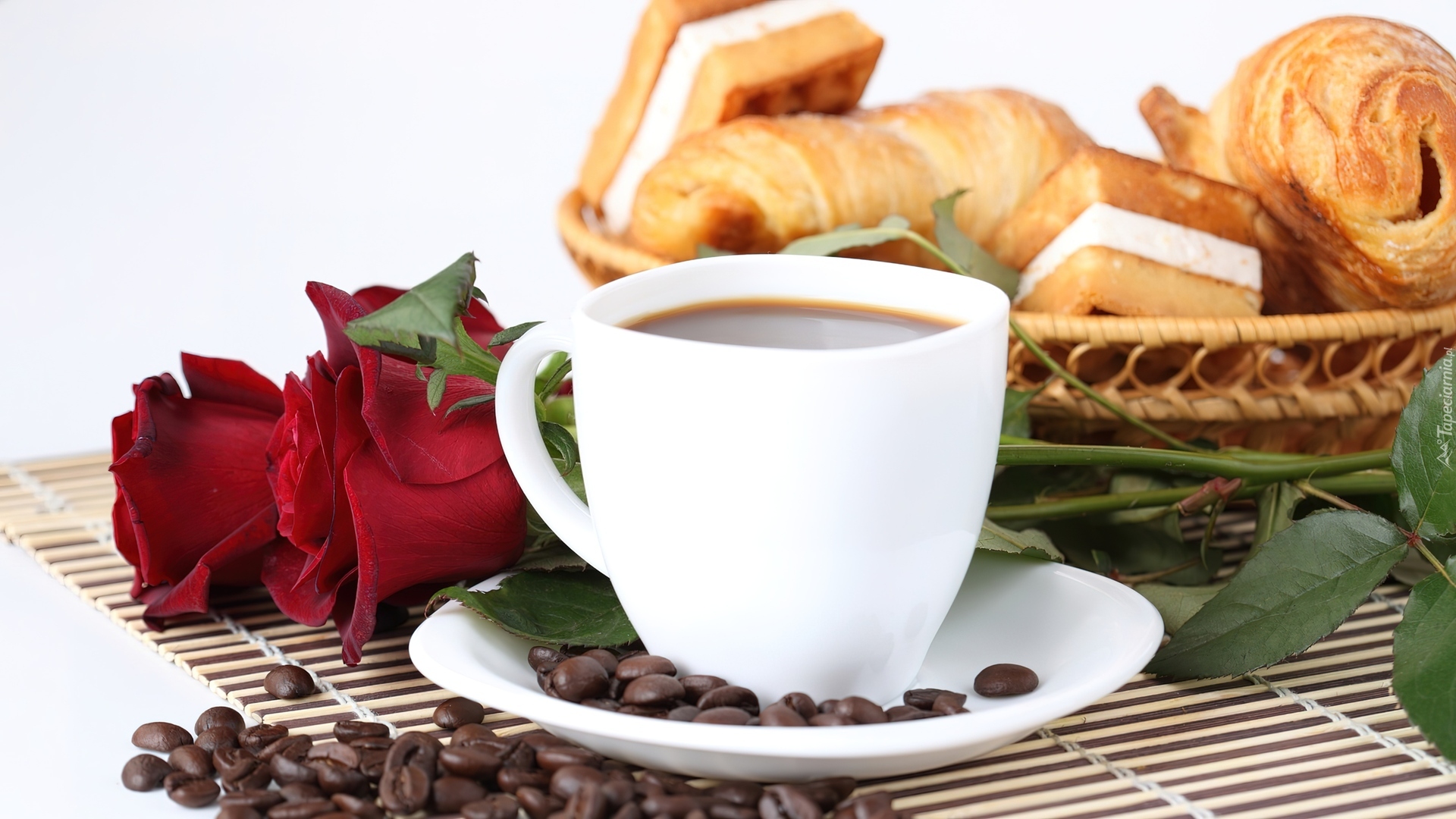 Edytor tapety: Filiżanka, Kawy, Świeże, Bułeczki, Koszyk, Róża