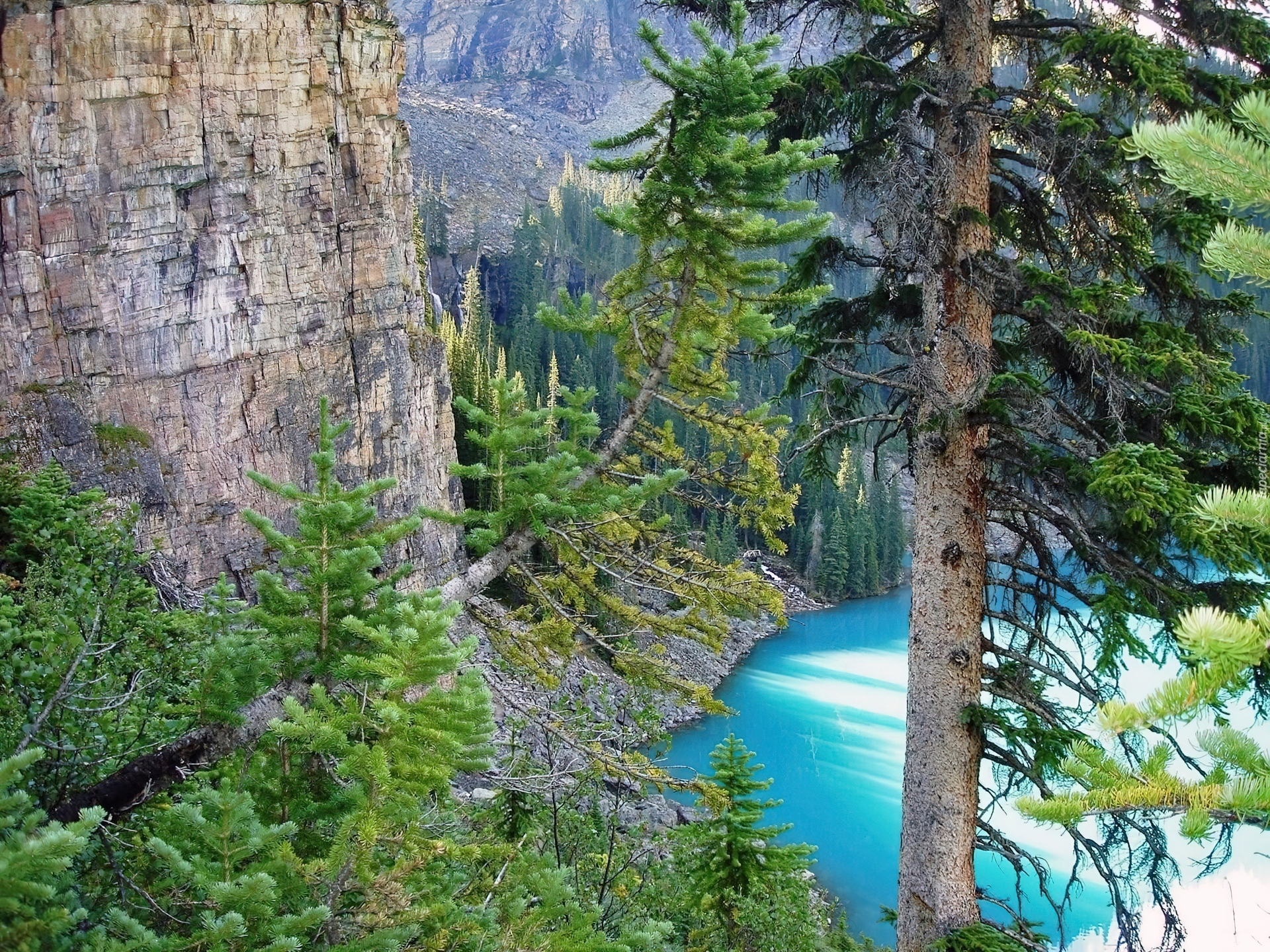 Edytor tapety: Jezioro, Skały, Drzewa, Iglaste