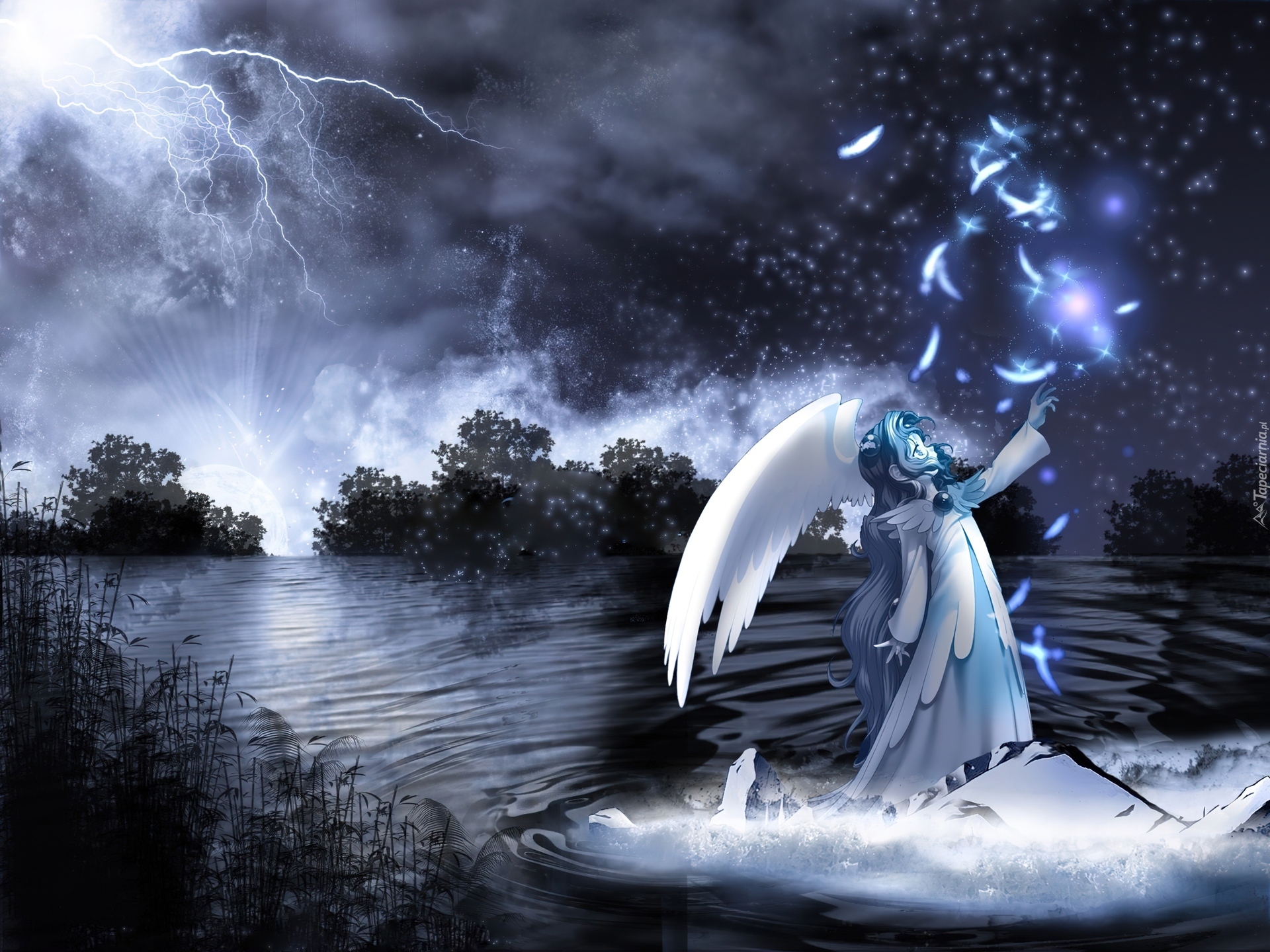 Edytor tapety: Dziewczyna, Anioł, Pioruny, Woda