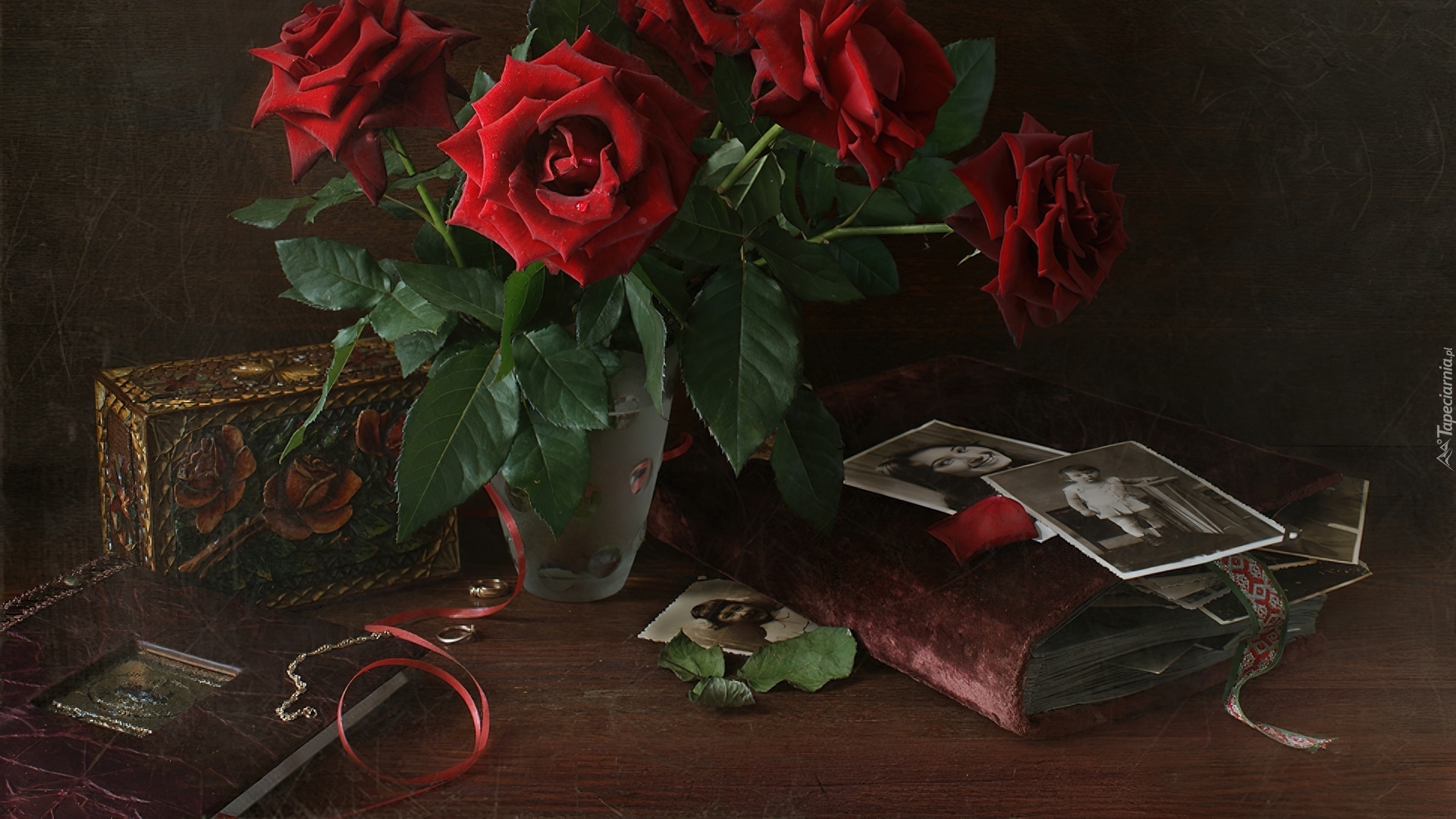 Edytor tapety: Wazon, Czerwone, Róże, Stare, Albumy, Zdjęcia