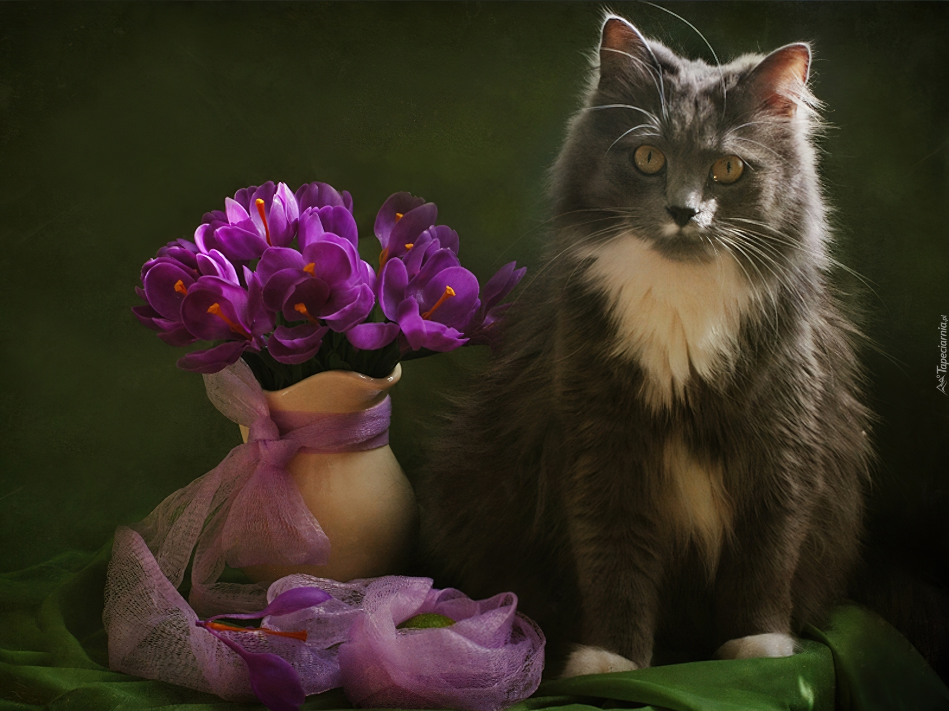 Edytor tapety: Kot, Bukiecik, Fioletowych, Kwiatów, Wazon