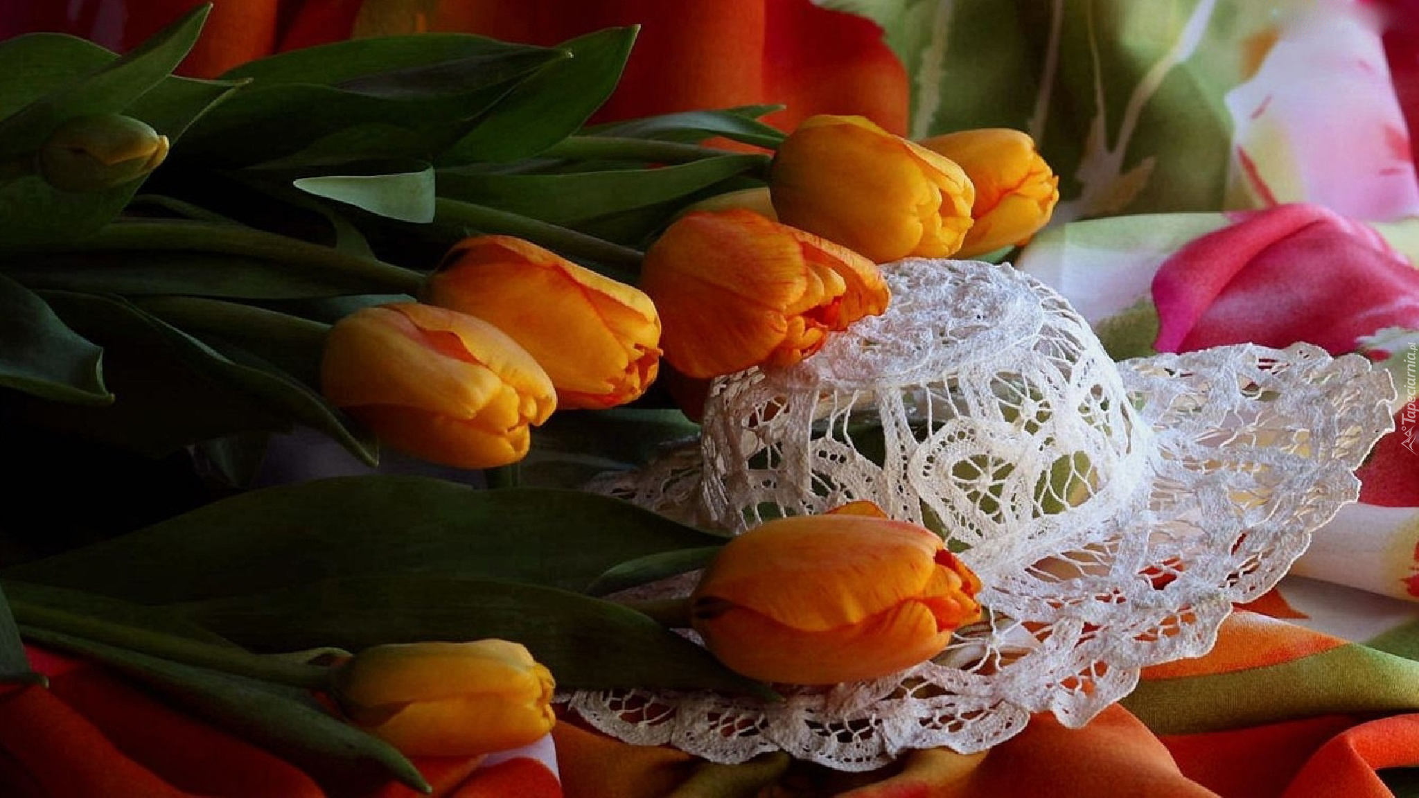 Edytor tapety: Pomarańczowe, Tulipany, Koronkowy, Kapelusz