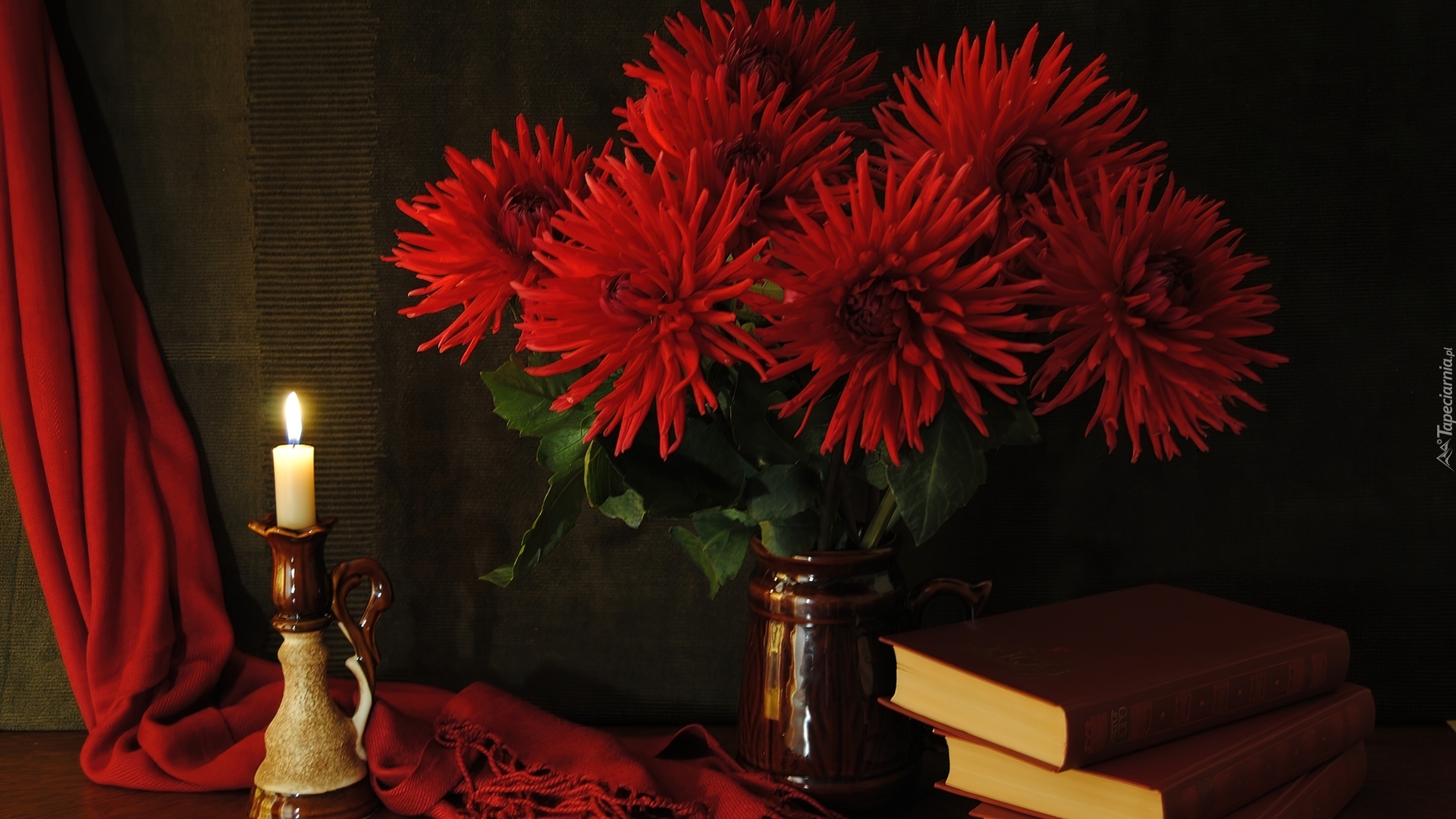 Edytor tapety: Bukiet, Czerwonych, Kwiatów, Książki, Świeca, Kompozycja