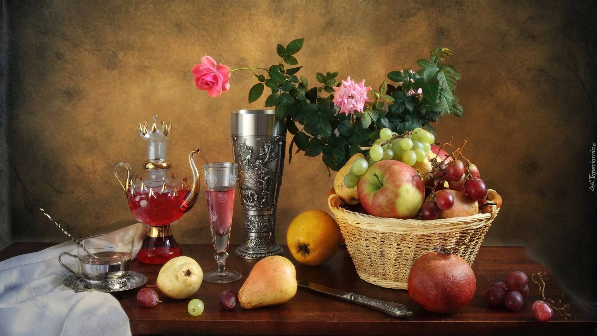 Edytor tapety: Kosz, Owoce, Róże, Wino, Kieliszki, Kompozycja