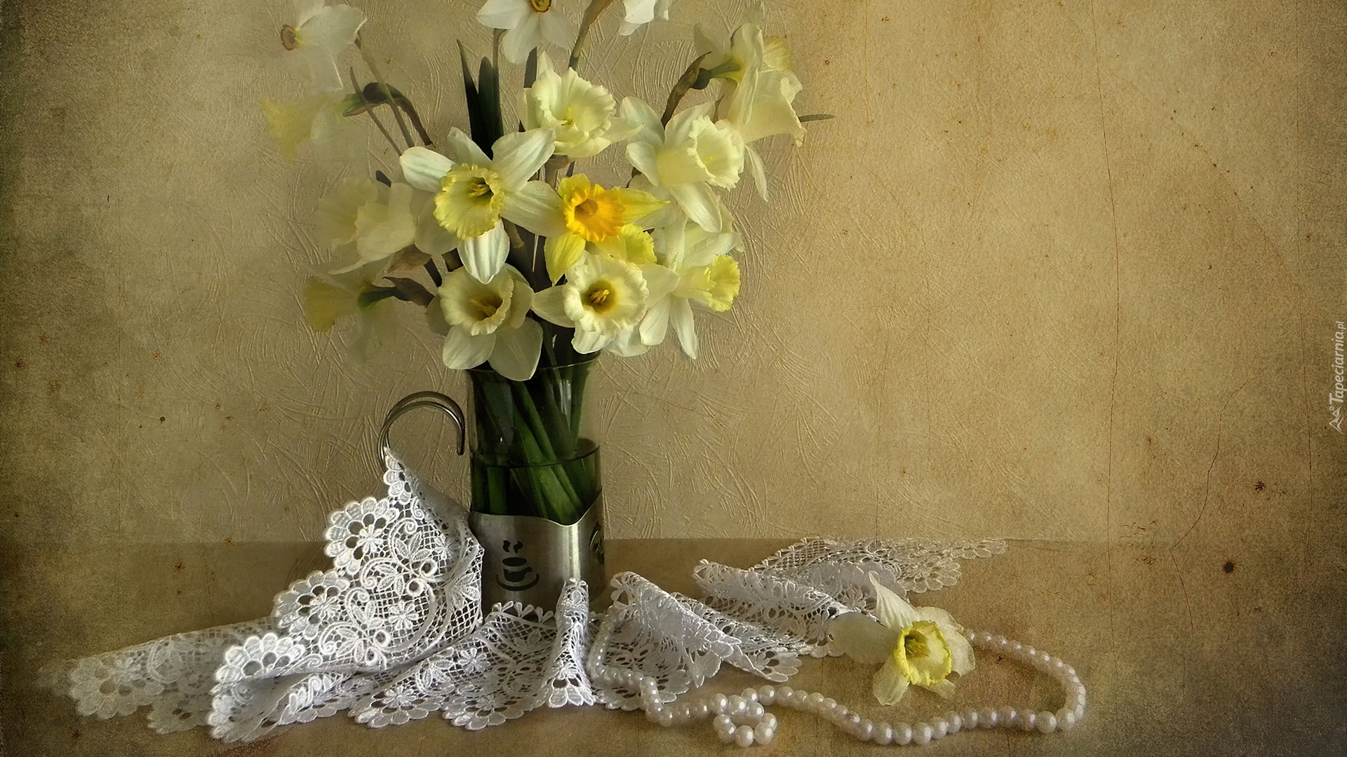 Edytor tapety: Wazon, Żółte, Żonkile, Perły, Koronka