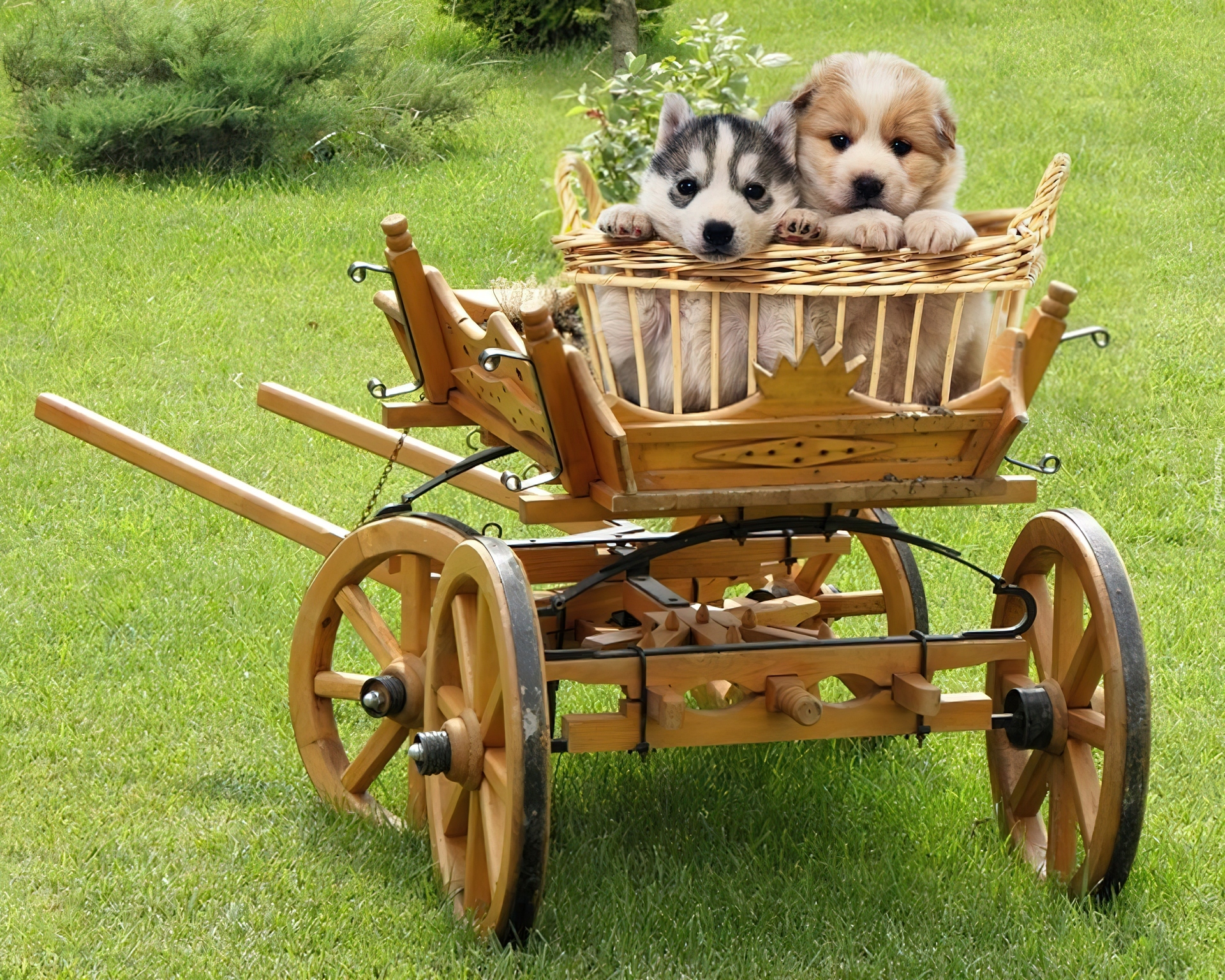 Edytor tapety: Dwa, Szczeniaczki, Koszyk, Wózek, Siberian Husky