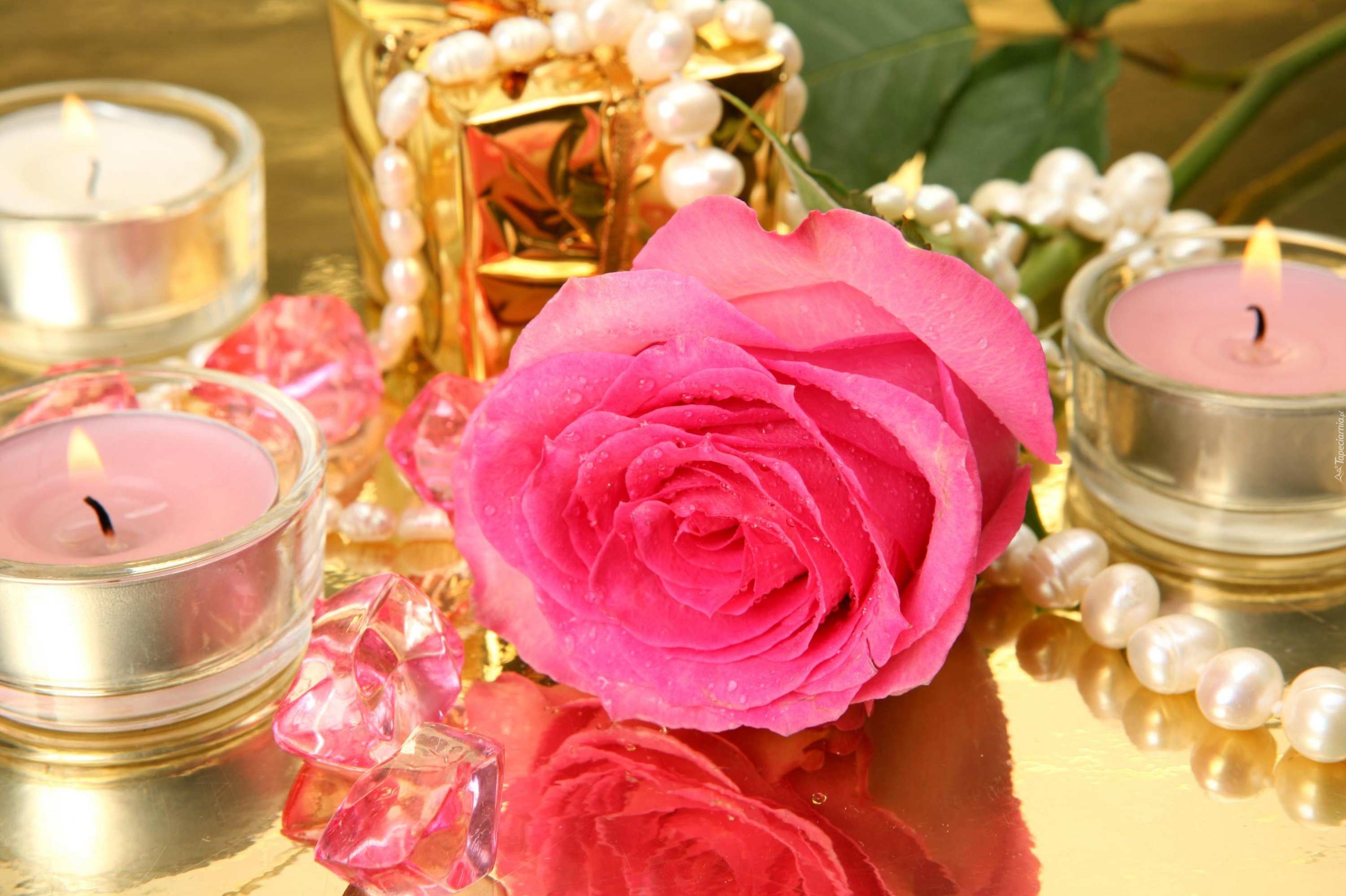 Edytor tapety: Różowa, Róża, Świece, Perły, Kompozycja
