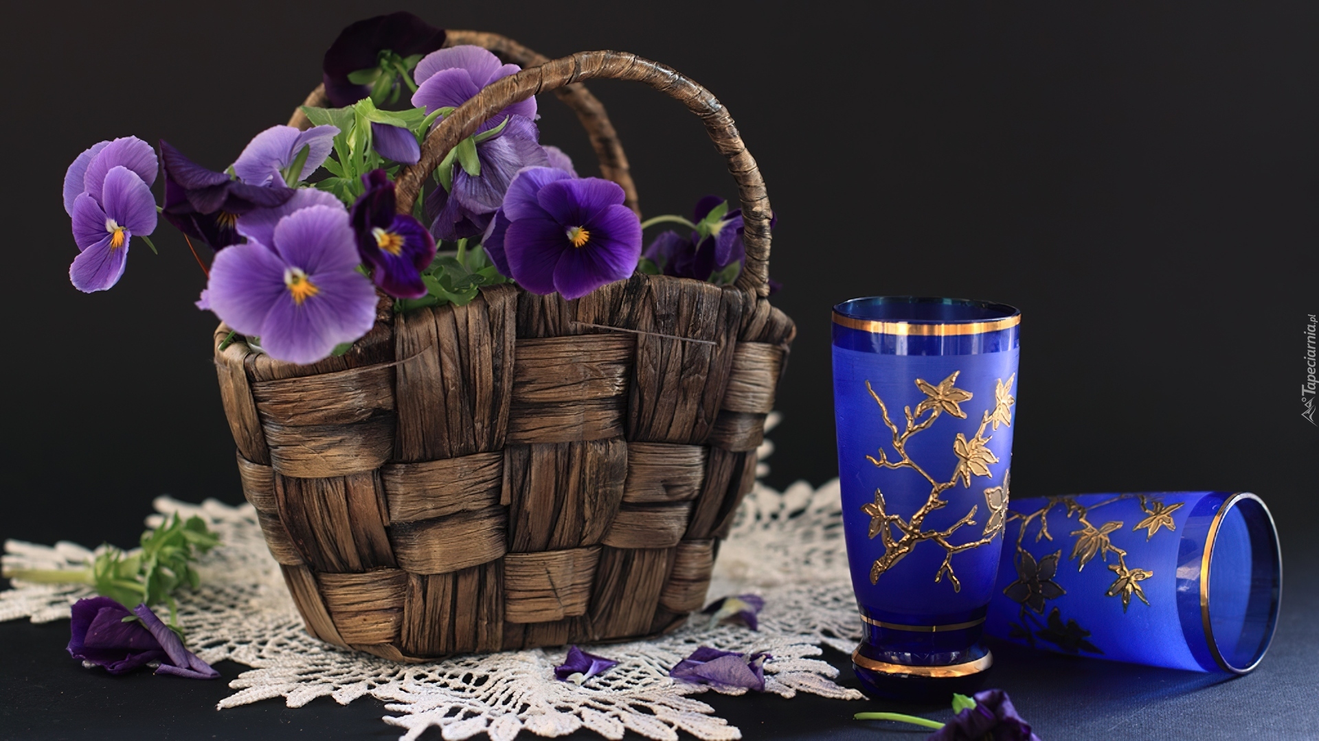 Edytor tapety: Koszyk, Fioletowe, Bratki, Szklaneczki