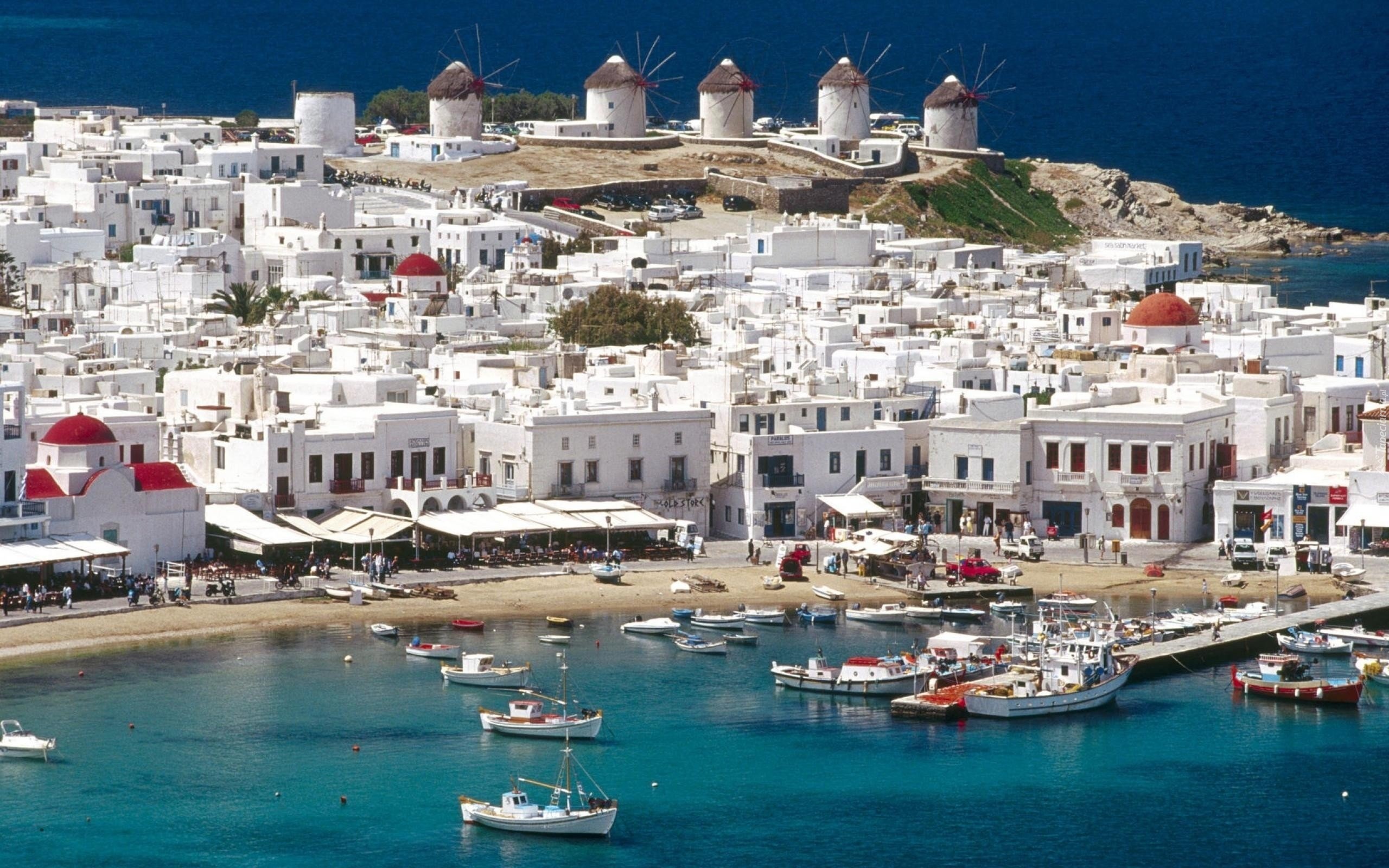 Edytor tapety: Plaża, Mykonos, Grecja, Wiatraki