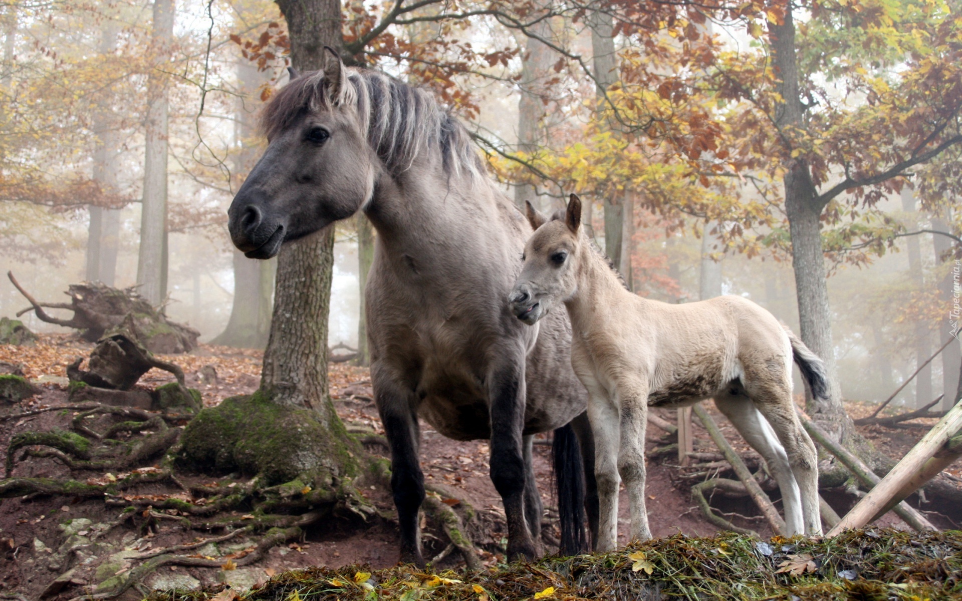 Edytor tapety: Konie, Las, Mgła
