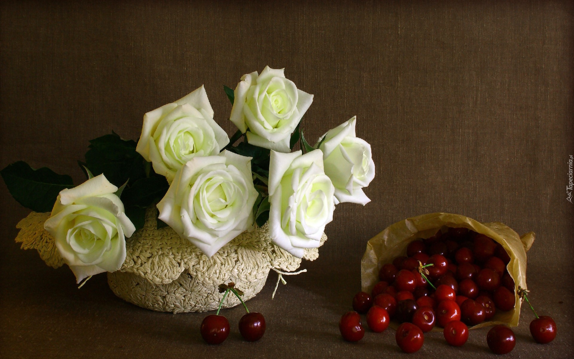Edytor tapety: Białe, Róże, Kapelusz, Wiśnie