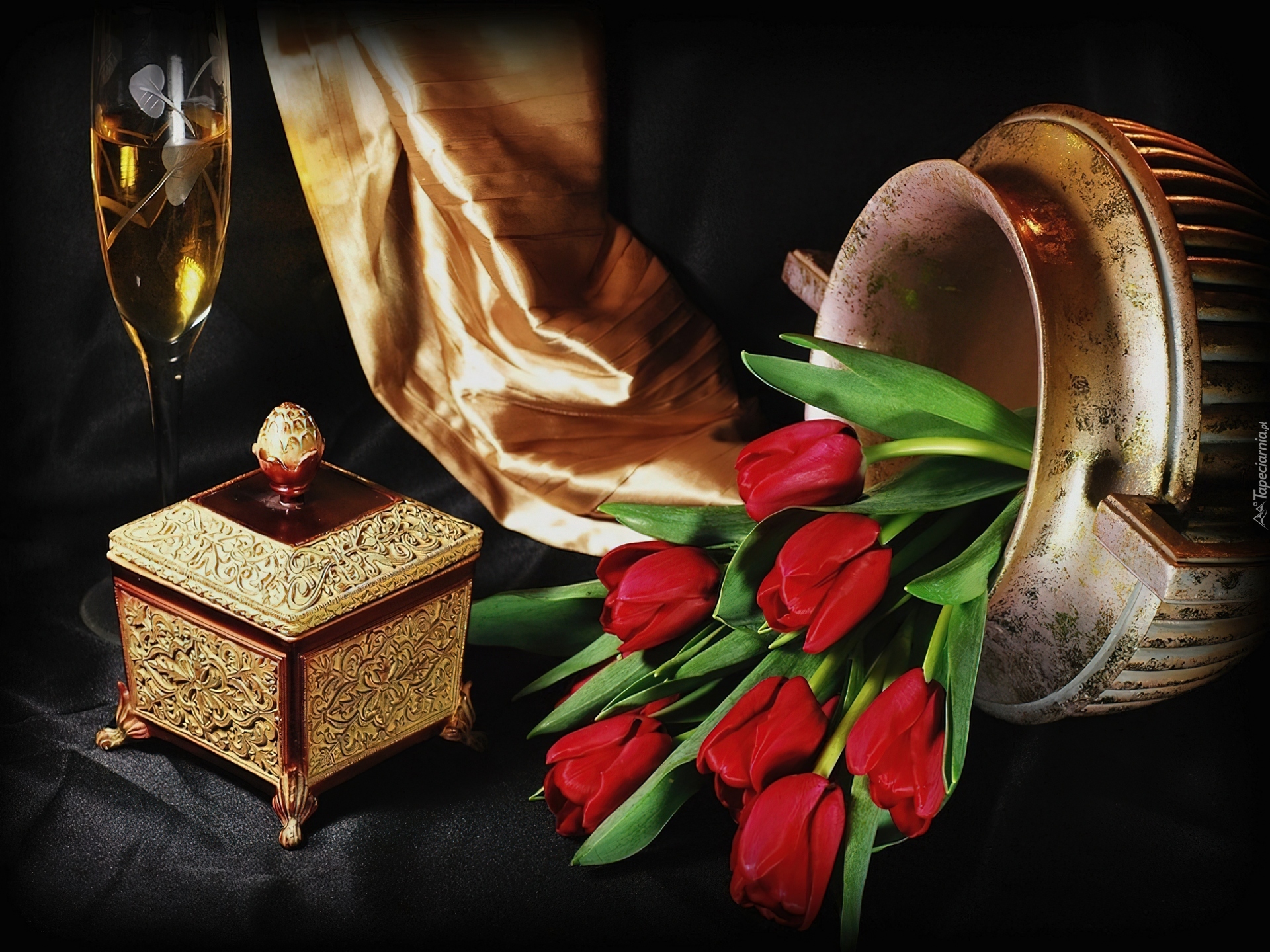 Edytor tapety: Czerwone, Tulipany, Waza, Kuferek, Atłas