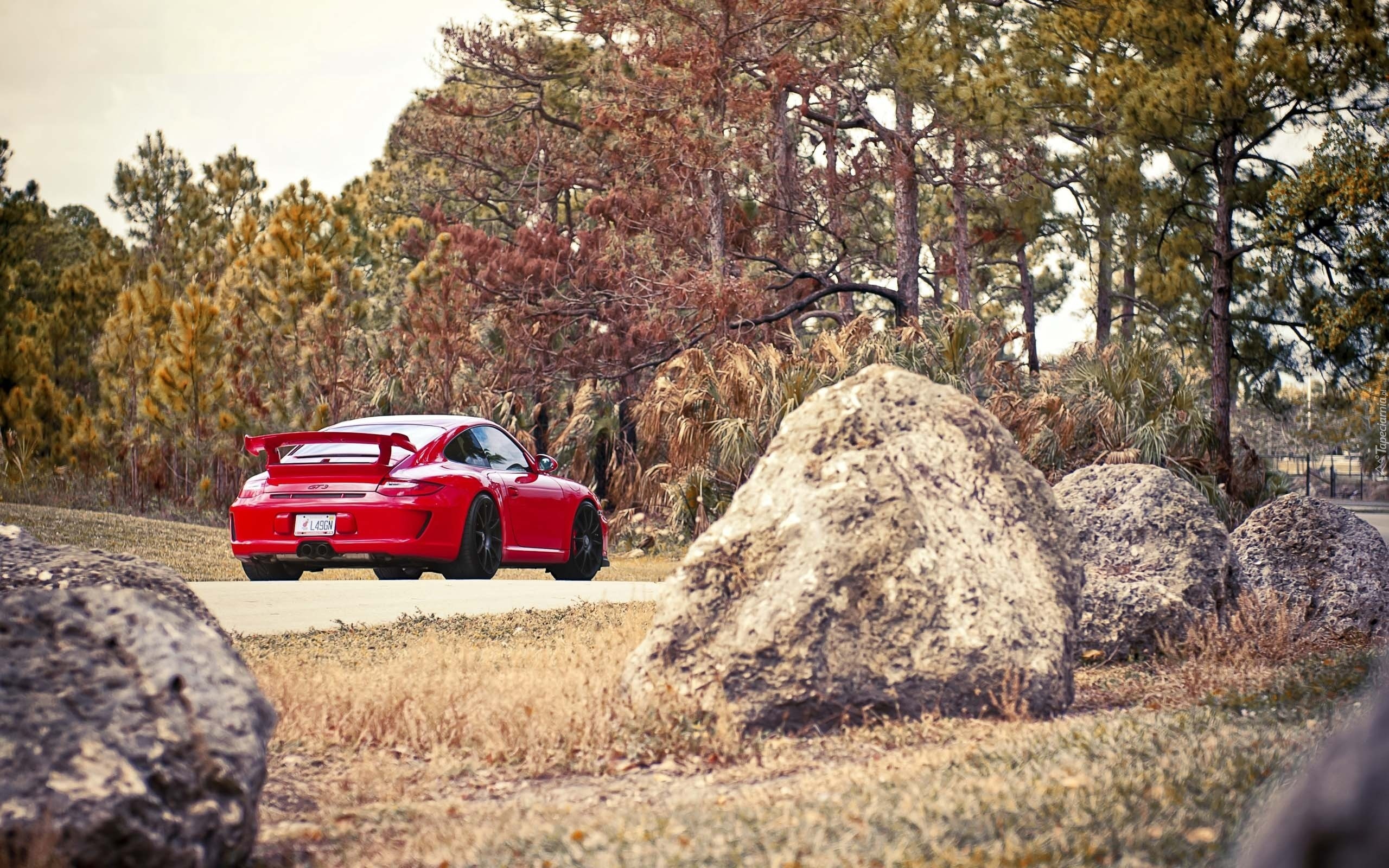 Edytor tapety: Czerwone, Porsche, 911, Drzewa, Kamienie