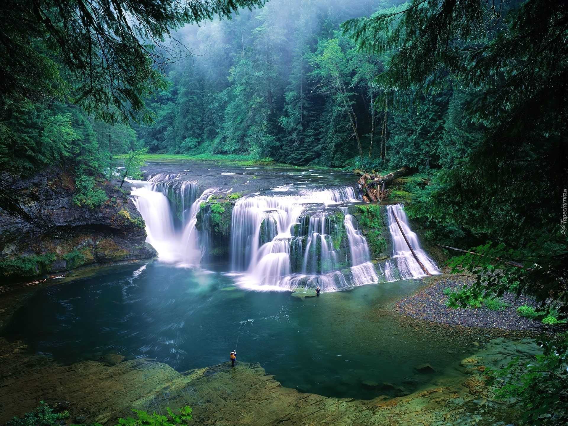 Edytor tapety: Wodospad, Rzeka, Las, Wędkarze