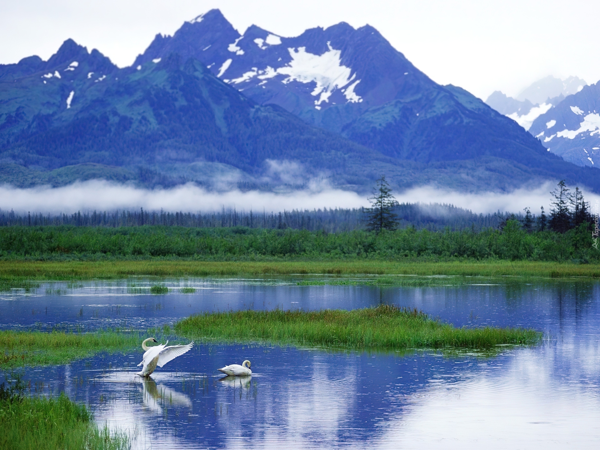 Edytor tapety: Góry, Jezioro, Łabędzie, Alaska