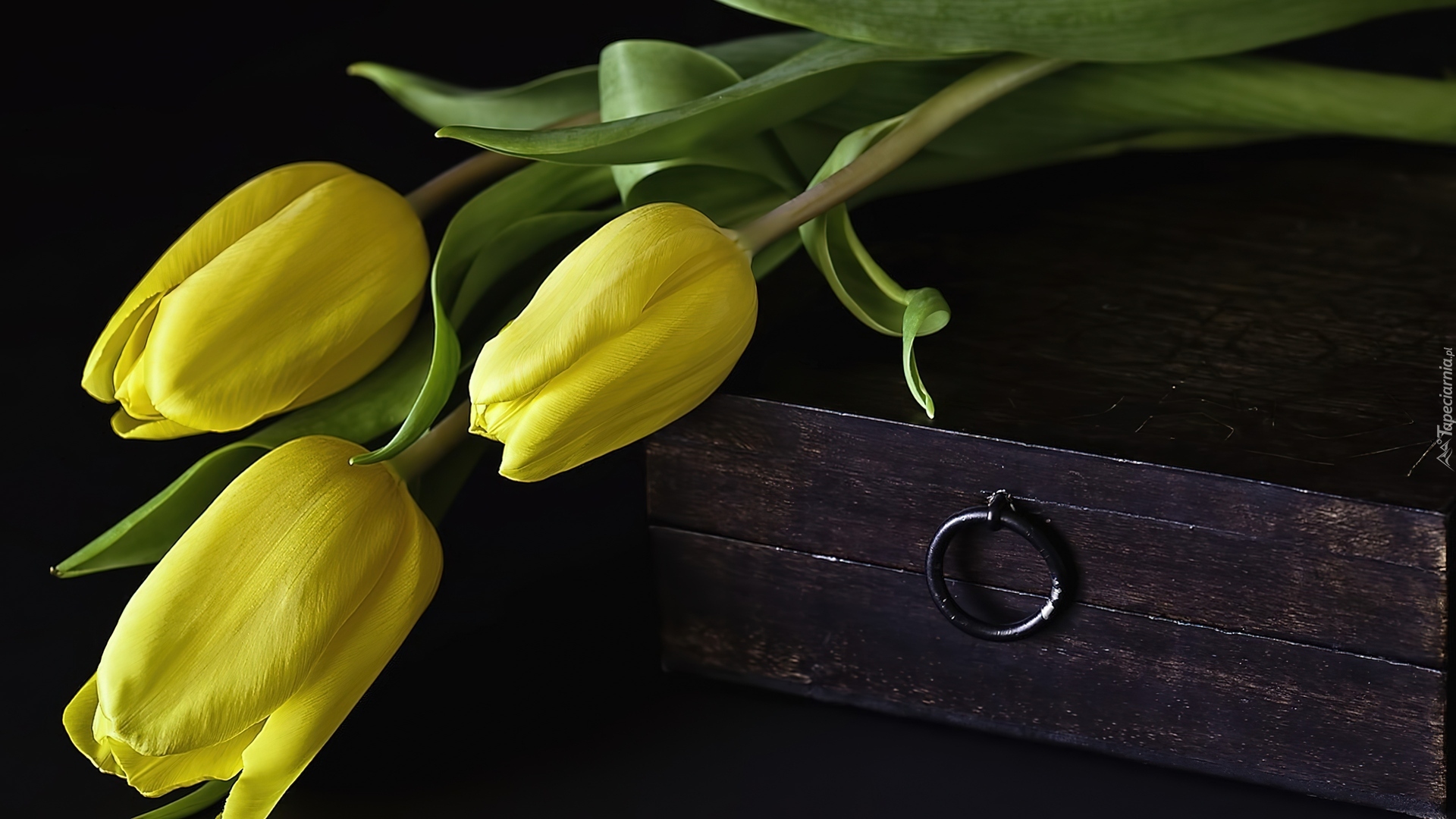 Edytor tapety: Żółte, Tulipany, Drewniany, Kuferek