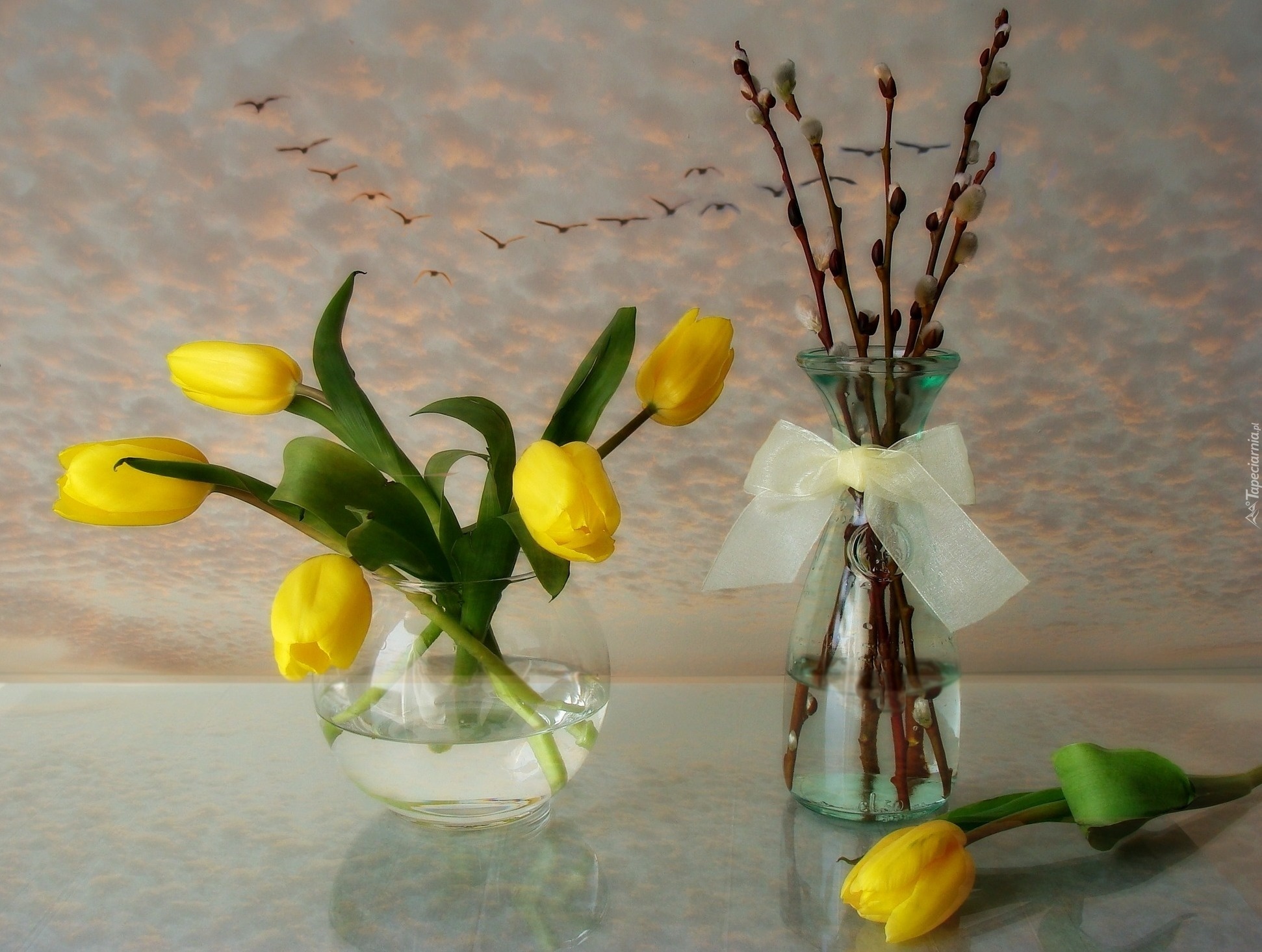 Edytor tapety: Szklane, Wazony, Żółte, Tulipany, Wstążka, Bazie
