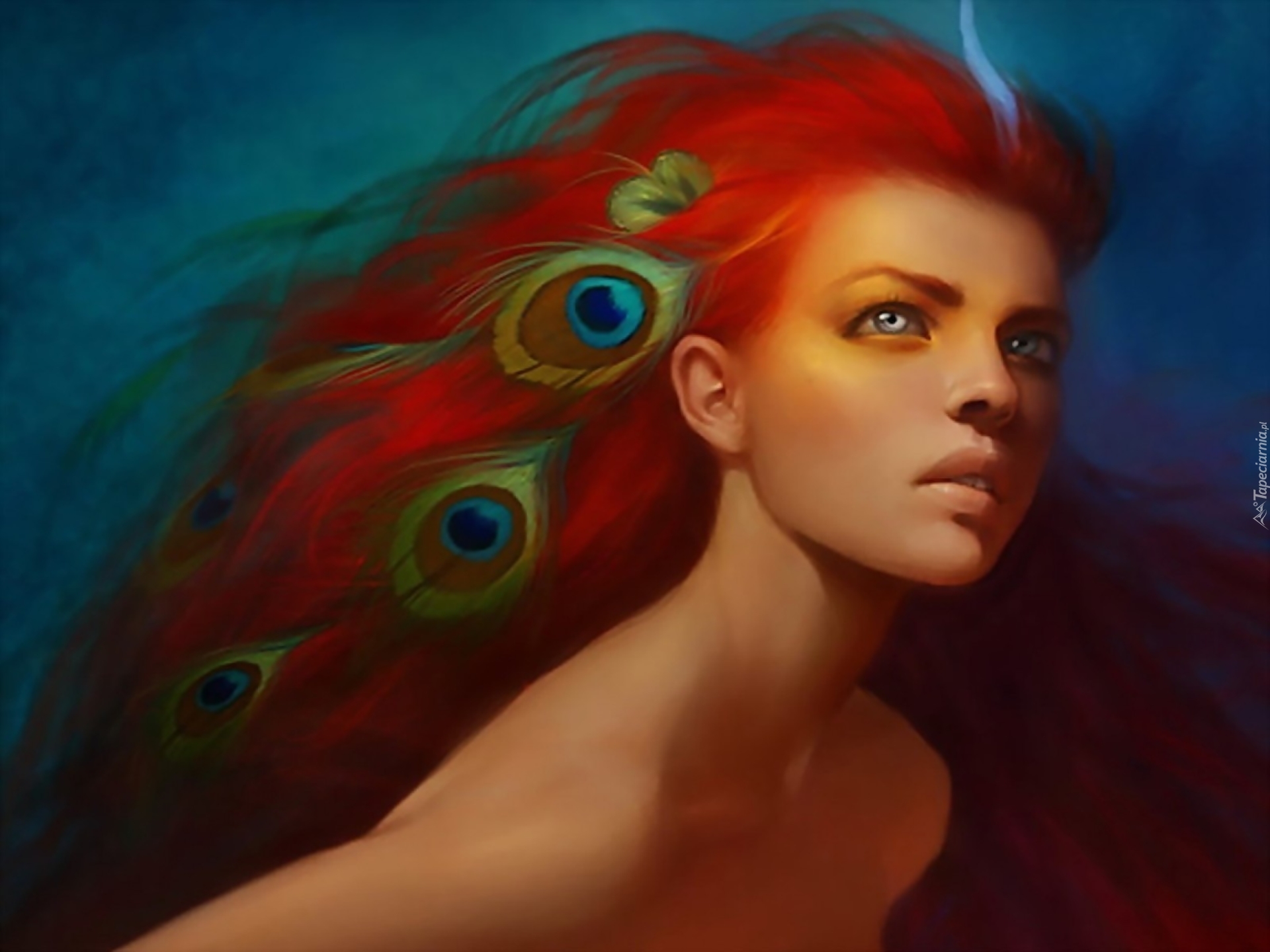 Edytor tapety: Kobieta, Włosy, Pawie, Pióra