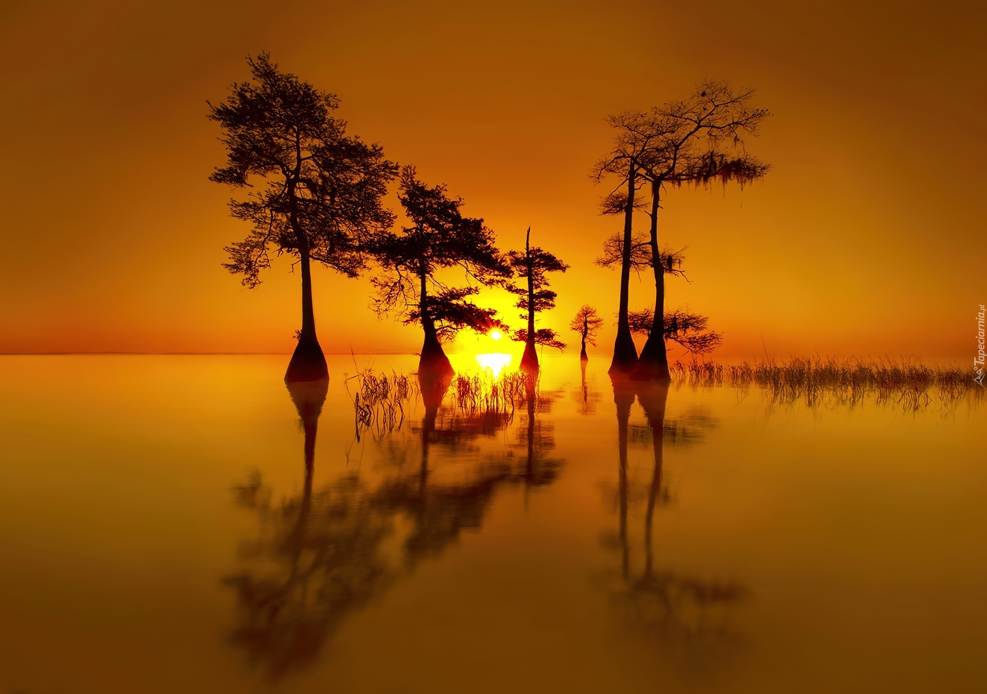 Edytor tapety: Zachód, Słońca, Jezioro, Drzewa, Odbicie