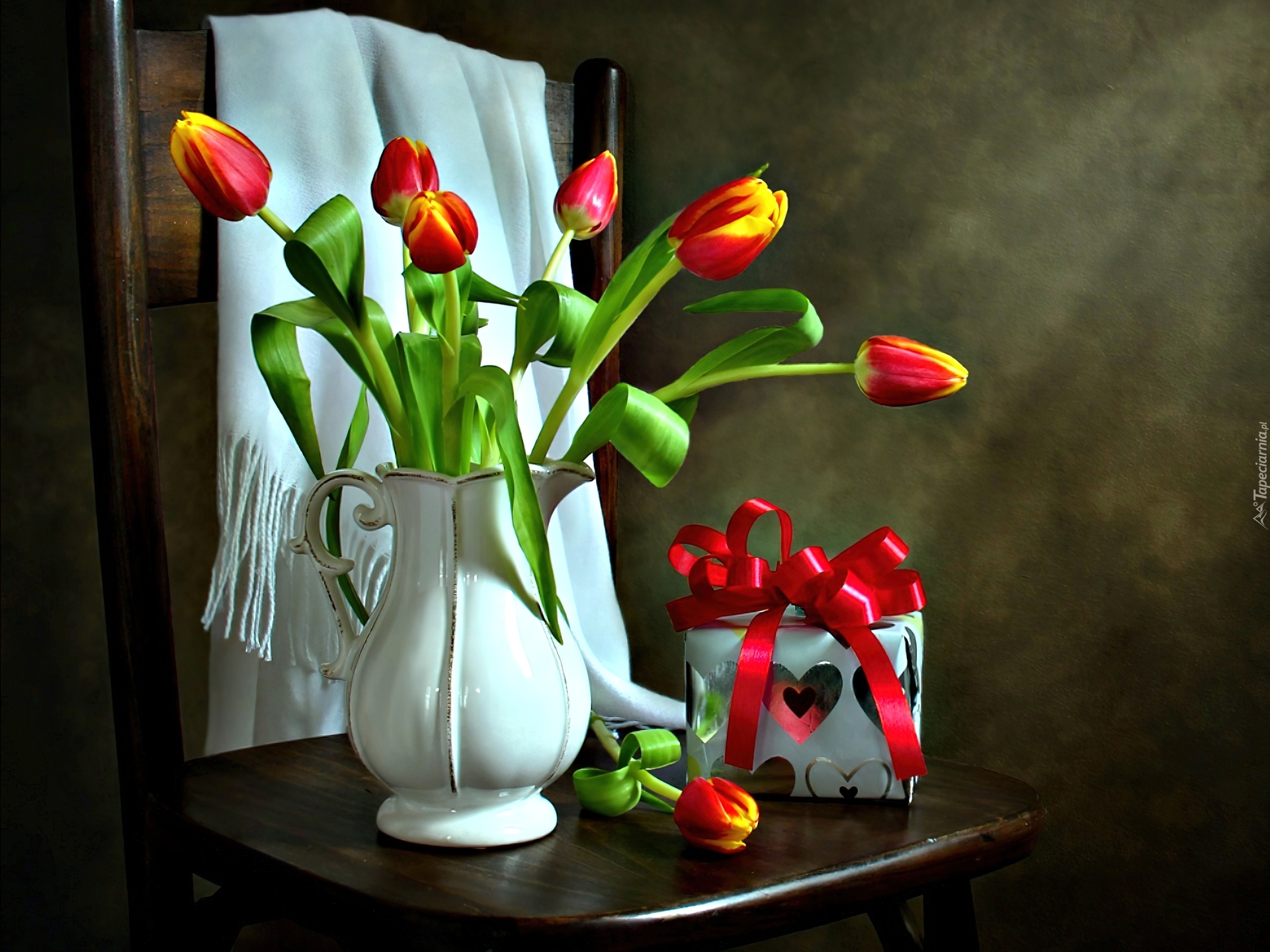 Edytor tapety: Dzban, Tulipany, Prezent, Wstążka, Biały, Szal