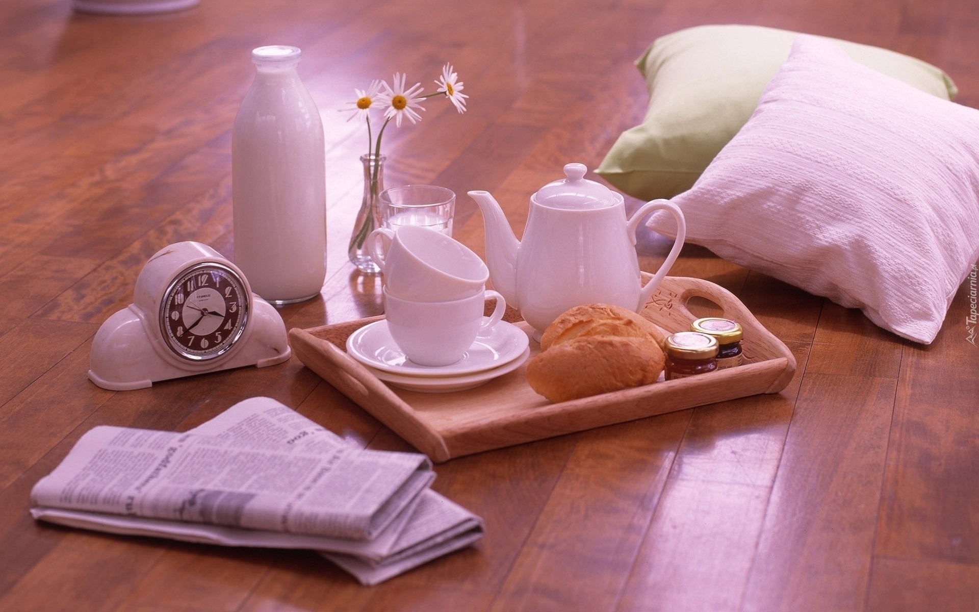 Edytor tapety: Poduszki, Mleko, Budzik, Śniadanko, Biała, Porcelana