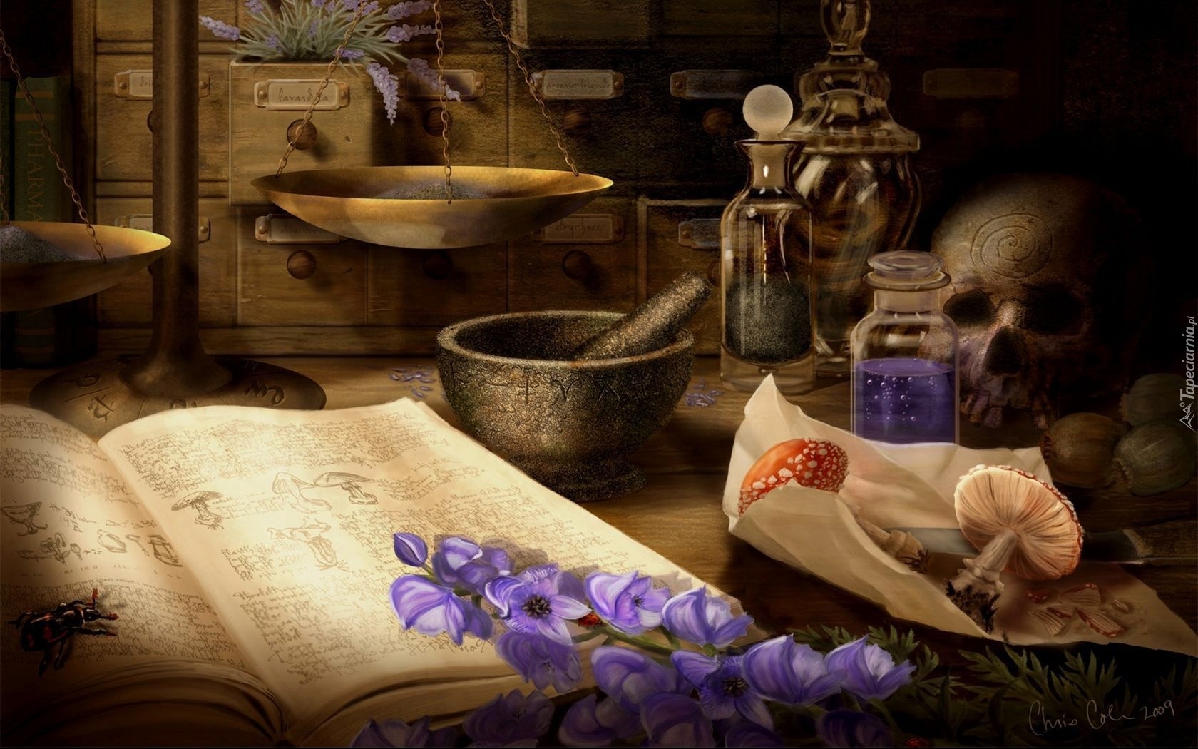 Edytor tapety: Księga, Kwiaty, Czaszka, Micha, Mikstury