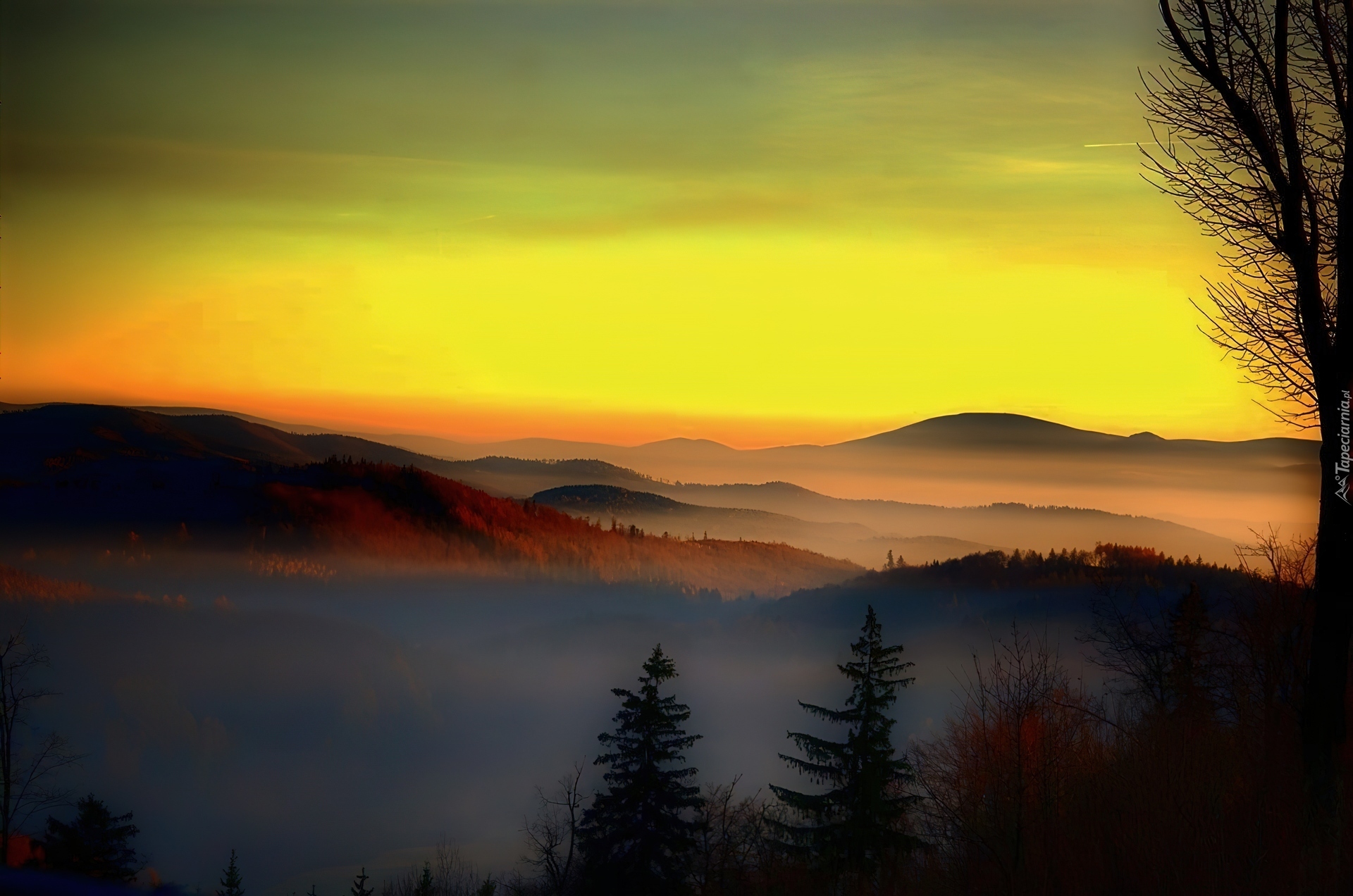 Edytor tapety: Góry, Mgła, Szczyty, Las, Niebo